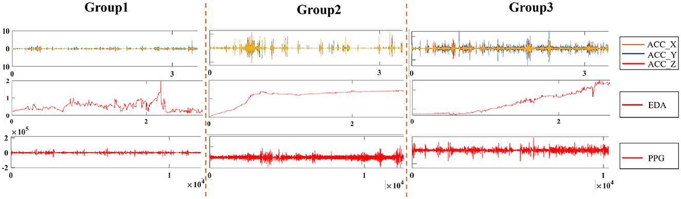 Figure 2 depicts the discharge patterns during non-rapid eye movement sleep across the three groups, illustrating distinct differences in their EEG activity. Group 3 exhibited greater EEG signal abnormalities than Group 1, where more stable patterns were observed. Figure 3 presents three types of physiological signals: accelerometer signals (ACC_X, ACC_Y, ACC_Z), electrodermal activity (EDA), and photoplethysmography (PPG). The figure demonstrates an overall increasing trend in the amplitude fluctuations of these physiological signals from Group 1 to Group 3. This pattern suggests that Group 3 patients may exhibit more active or unstable physiological states, while Group 1 patients maintain relatively stable physiological conditions. These differences may be related to the grouping criteria (e.g., SWI index) used in this study. Further analysis of the relationship between these physiological signals and clinical indicators could provide deeper insights into patients' disease severity and changes in their physiological state.