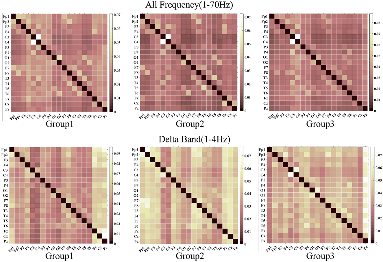 We employed DTF to characterize brain network dynamics for functional connectivity visualization and analysis, as shown in Figures 4, 5. The whole frequency band (1–70 Hz) and delta band (1–4 Hz) exhibited enhanced functional connectivity in the centrotemporal regions, reflecting increased neuronal synchronization associated with epileptiform discharges. Comparative analysis revealed significant between-group differences in connectivity patterns, demonstrating the influence of SWI levels on interregional functional organization. Graph-theoretical analysis further indicated that higher SWI levels were associated with decreased network diffusion and routing efficiency.