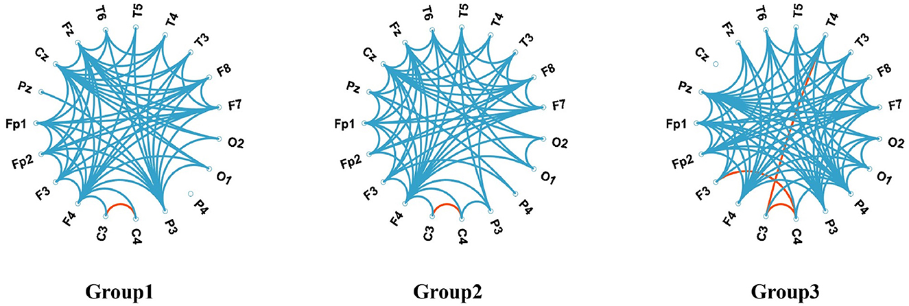 Figure 5. Chordal maps illustrate the differences in brain network connectivity. Blue lines indicate that Delta bands exhibit reduced functional connectivity compared to the full-screen segment bands. In contrast, red lines show that Delta bands have increased functional connectivity compared to the full-screen segment bands.