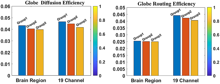We conducted a detailed analysis of graph-theoretical metrics, focusing on diffusion and routing efficiency of SeLECTs activity, as illustrated in Figure 6. Participants were stratified into three groups based on SWI levels: Group 1 (50%–65%), Group 2 (65%–80%), and Group 3 (85%–100%). The analysis revealed an inverse relationship between SWI levels and network efficiency metrics, with both diffusion and routing efficiency demonstrating significant declines as SWI increased. This pattern indicates that heightened epileptiform discharges impair the brain's capacity for information propagation and integration (30). The observed network inefficiencies may underlie specific cognitive deficits, particularly in attention, memory, and executive functioning.