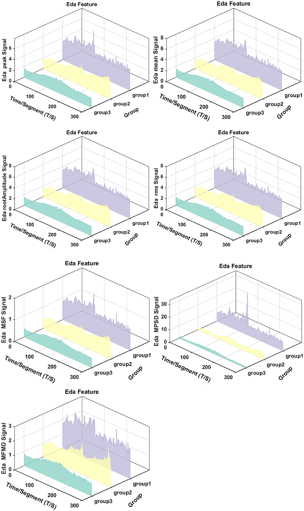 Figure 7. The figure reveals significant intergroup differences in the spatiotemporal dynamics of EDA. From left to right, the features include EDA Peak, EDA Mean, EDA Root Amplitude, and EDA RMS in the time-domain, as well as EDA MSF, EDA MPSD, and EDA MFMD in the frequency-domain. Peak, Peak; Mean, Mean; RAT, Root Amplitude; RMS, Root Mean Squared; MSF, Mean Square Frequency; MPSD, Mean Power Spectral Density; MFMD, Mean Frequency of Maximum Deviation.