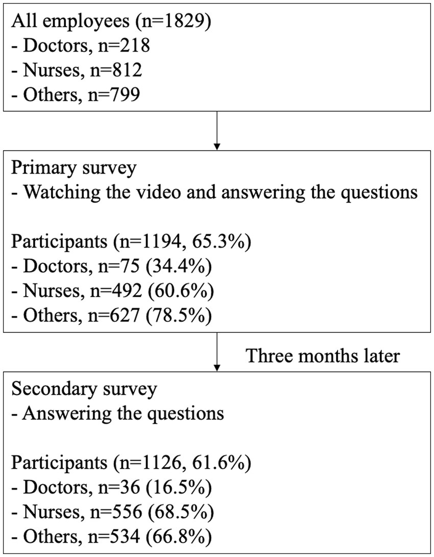 As shown in Figure 1, of the total 1,829 participants in the primary survey, 1,194 participated in the primary survey, and 1,126 participated in the secondary survey. Among the respondents, 75 of 218 doctors (34.4%), 492 of 812 nurses (60.6%), and 627 of 799 other healthcare professionals (78.5%) participated.