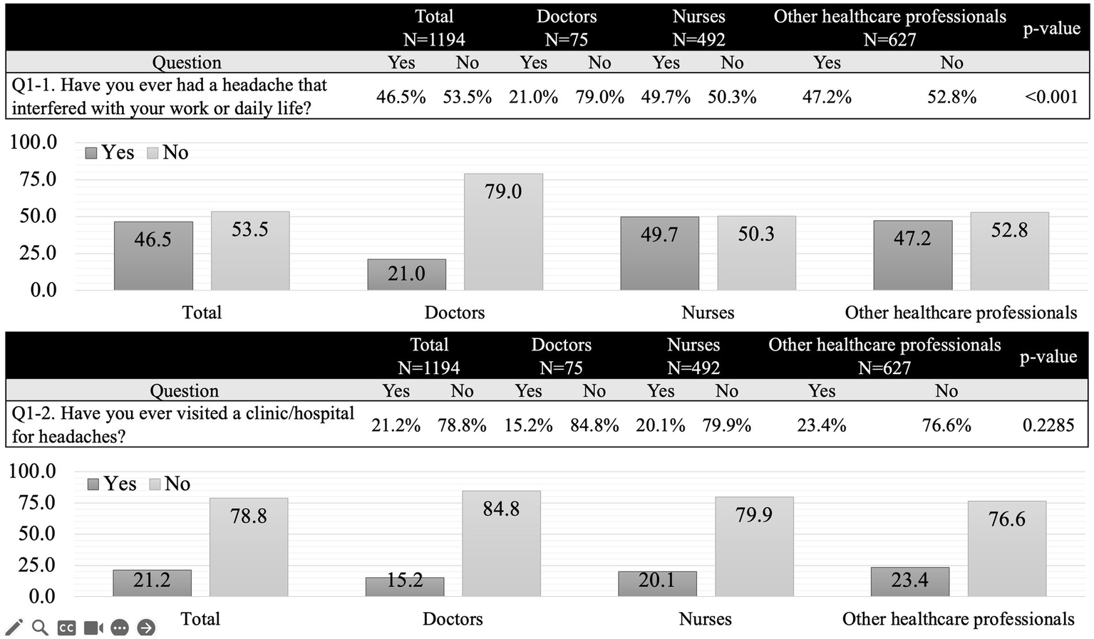 Primary survey. Compared to doctors, nurses and other healthcare professionals were more than twice as likely to experience headaches that interfered with work or daily life, with one in two reporting such issues. However, only approximately 20% had visited a medical institution for headaches.