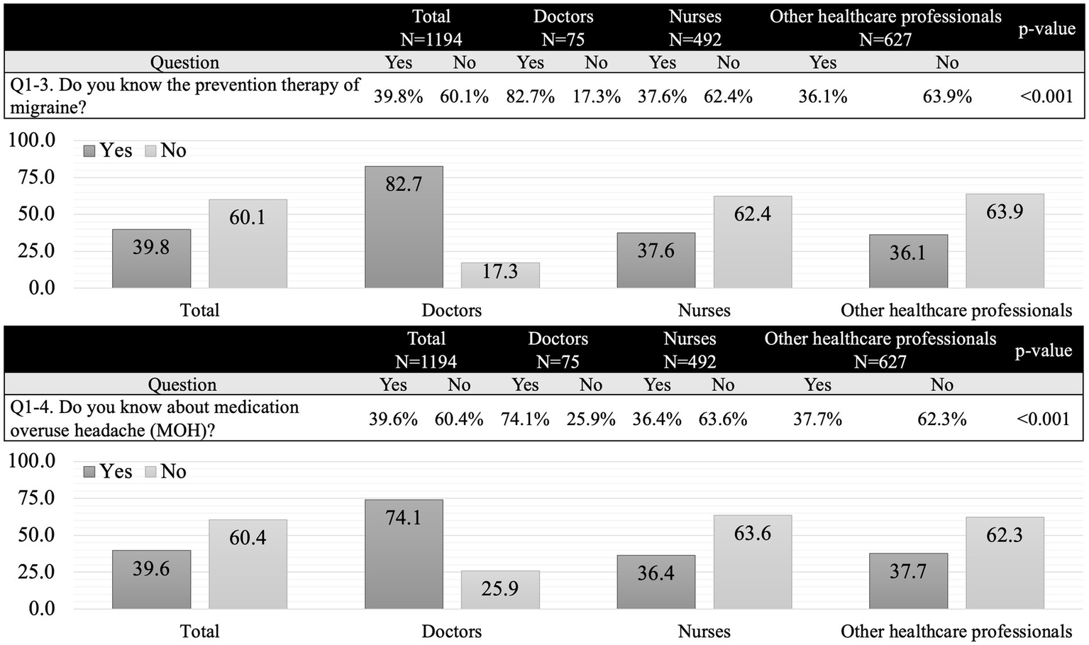 Primary survey. More than three-quarters of doctors were aware of preventive treatments for migraines and medication overuse headaches, whereas less than 40% of nurses and other healthcare professionals had similar awareness. These results suggest that nurses’ knowledge of headaches is comparable to that of other healthcare professionals.