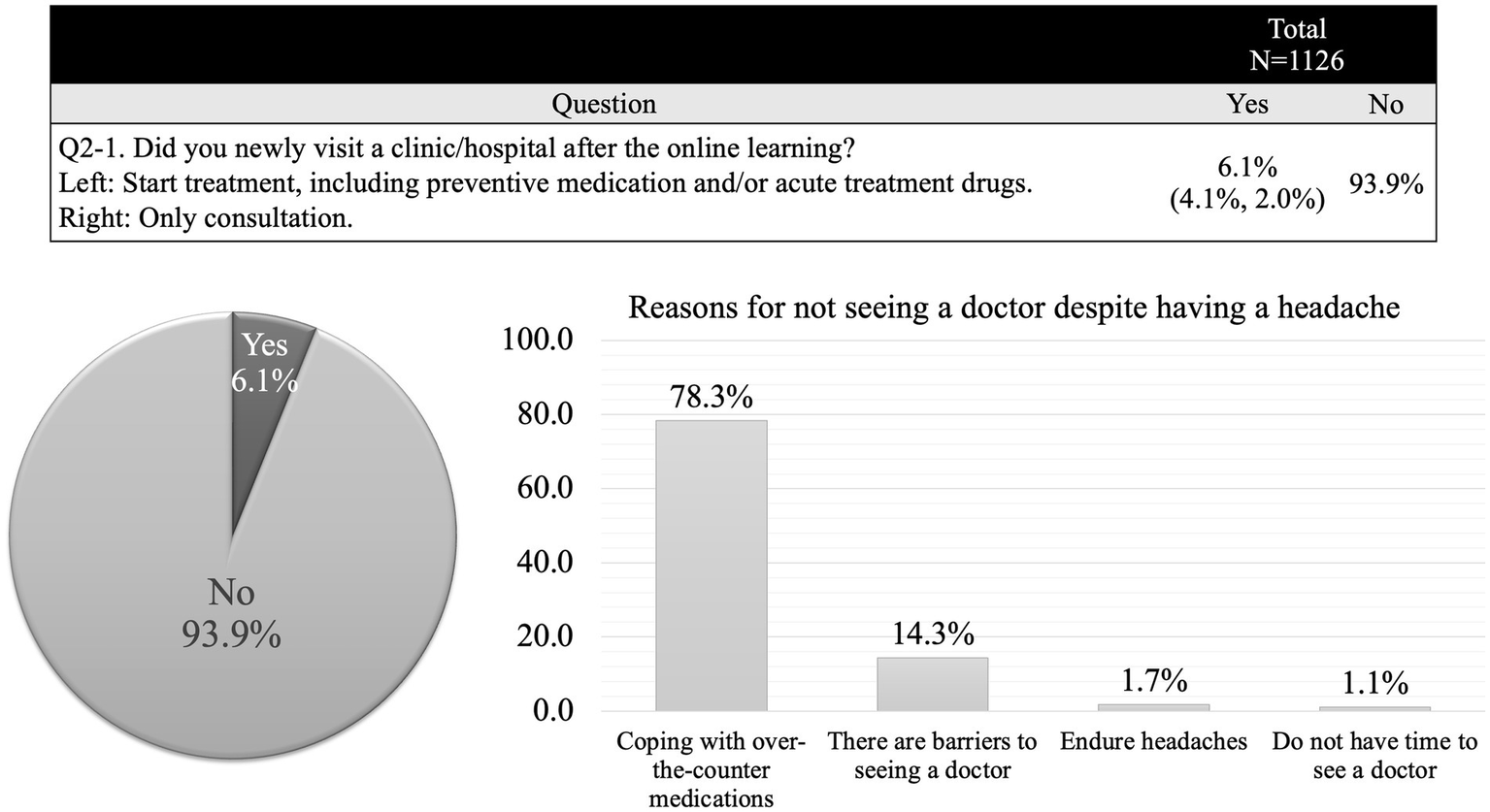 There are several limitations in this study. First, as the follow-up period was only 6 months and online video viewing was only performed for the first time, we believe that creating a system that provides more frequent e-learning over a long period is necessary. Second, the survey was conducted at in-house terminals. Because all employees had access to the terminals, there were no restrictions on accessing the questionnaire. However, as participation in the survey was voluntary, there was bias towards only those interested in headaches, particularly those who suffered from headaches. Therefore, we added questions about daily quality of life to encourage people without headaches to participate. However, even for medical professionals, the information does not reach those who are not interested in headaches. How to deal with this will be an issue for future research. Third, the exact number of individuals who had received preventive treatment before the first questionnaire is unknown. However, given that approximately 20% of participants visited medical institutions with headaches as their primary complaint and that 60% of non-physician staff were unaware of preventive treatments, the number of individuals receiving such treatment is expected to be low. Fourth, social desirability bias is presumed to exist. However, it has not been quantitatively assessed using the Marlowe-Crowne Social Desirability Scale or other methods. While anonymization is one approach to mitigating social desirability bias, in this study, it was essential to analyze the results of the first and second questionnaires together. Therefore, the data were collected without anonymization. Fifth, in this study, 805 participants responded to both the first and second surveys. While this can be interpreted as a positive trend for the group, the possibility that the analysis was insufficient in accounting for the temporal continuity of the data cannot be ruled out. Finally, this study did not include a control group and did not evaluate or compare the rate of behavioral change with or without online learning. Therefore, it does not precisely reflect the impact of a single online learning session. However, providing all employees with an opportunity to learn about headaches once, followed by a decrease in the frequency of painkiller use and an increase in first-time visits to a clinic/hospital, yielded highly valuable results.