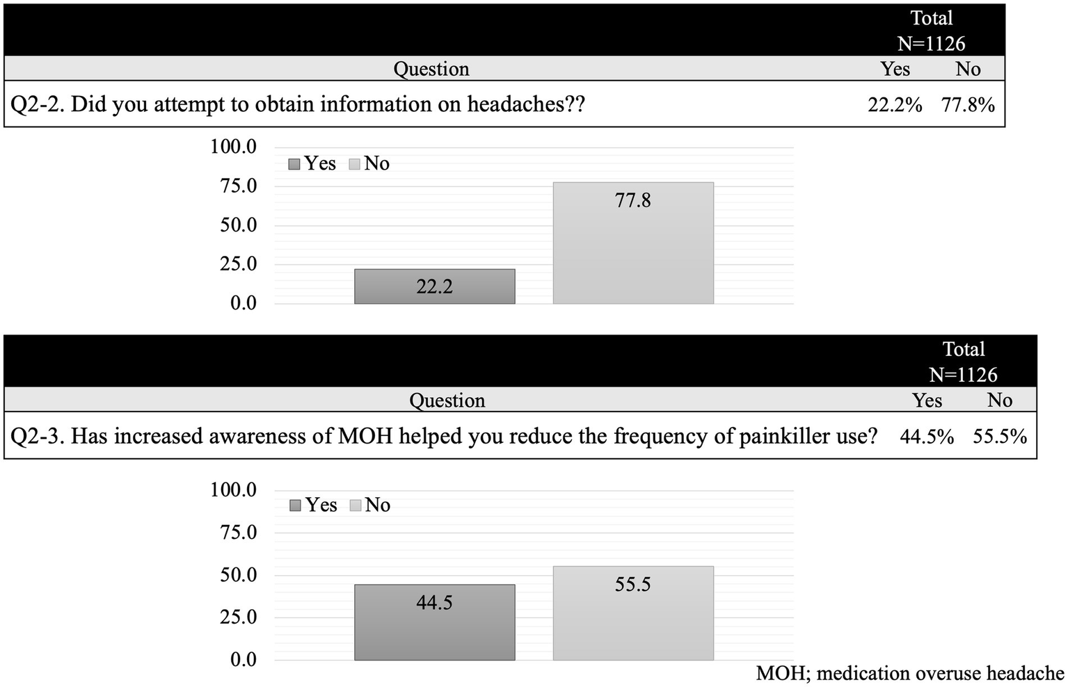 In our survey, less than 40% of the respondents were aware of MOH, and considering that the most common reason given for not visiting a medical institution with headache as the main complaint was that over-the-counter medication was sufficient, it was assumed that a certain number of people had or were developing MOH. However, in a survey conducted 3 months after the initial headache awareness campaign, just under half of the respondents said that they were now more aware of the number of times they used acute medication and could make an effort to reduce it in some cases. It is important to continue headache awareness campaigns, acquire correct knowledge, and perform preventative treatments as necessary.