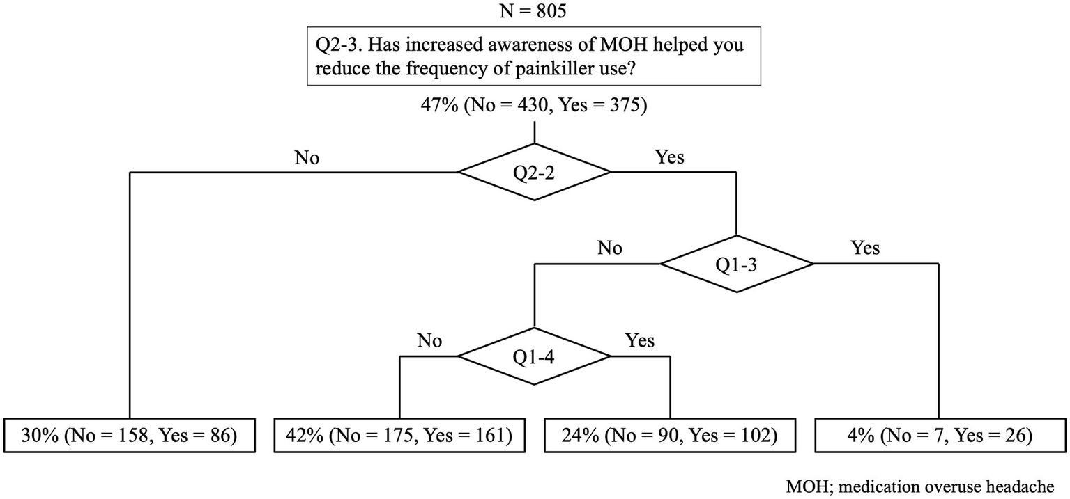 A total of 805 participants were included in the decision tree analysis, which aimed to investigate the factors influencing the reduction in painkiller use following increased awareness of medication overuse headache (MOH). The primary decision node (Q2-3) assessed whether participants reported that increased awareness of MOH helped them reduce the frequency of painkiller use. Among them, 47% (n = 375) answered “Yes,” while 53% (n = 430) answered “No.”