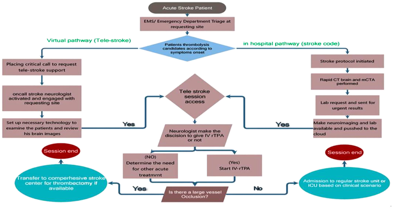 Upon connection, a remote stroke neurologist performs a real-time, directed neurological examination of the patient via a secure, high-definition videoconferencing platform. All consultations occur through a secure, encrypted platform integrated into the national digital health infrastructure. Patient identifiers and imaging data are transmitted via encrypted channels compliant with Ministry of Health (MOH) data governance policies, and access is restricted to authorized healthcare providers only. The neurologist concurrently reviews the patient's neuroimaging, including non-contrast CT and CTA scans, via direct access to the Picture Archiving and Communication System (PACS). The diagnosis and treatment decision are based on the integration of this real-time clinical information, which includes the patient's history, neurological examination findings (e.g., NIHSS), laboratory results (e.g., coagulation profile, blood glucose), and neuroimaging, all transmitted securely from the spoke hospital's electronic medical record and PACS systems to the SVH platform. Based on this comprehensive assessment and guideline-directed criteria, the SVH neurologist advises on eligibility for intravenous thrombolysis. Consent for thrombolysis (rt-PA) is obtained at the spoke hospital by the treating emergency physician or designated staff, in line with Saudi Ministry of Health policies. The SVH neurologist provides the treatment recommendation, outlines the risks and benefits to facilitate the informed consent process, and guides the local team.