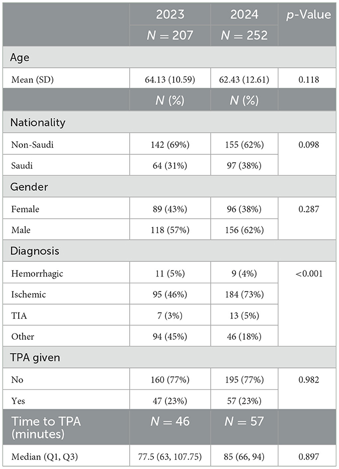 Results: The mean age of patients was 64.13 years in 2023 and 62.43 years in 2024. Non-Saudi patients constituted 69% in 2023, decreasing to 62% in 2024, while Saudi patients increased from 31 to 38%. Male patients rose from 57% in 2023 to 62% in 2024. Diagnoses showed significant variation: ischemic strokes increased from 46% in 2023 to 73% in 2024, while hemorrhagic strokes and other miscellaneous conditions decreased, and TIAs showed a slight increase. TPA administration remained stable at 23% in both years, and the median time to TPA administration showed no significant difference.