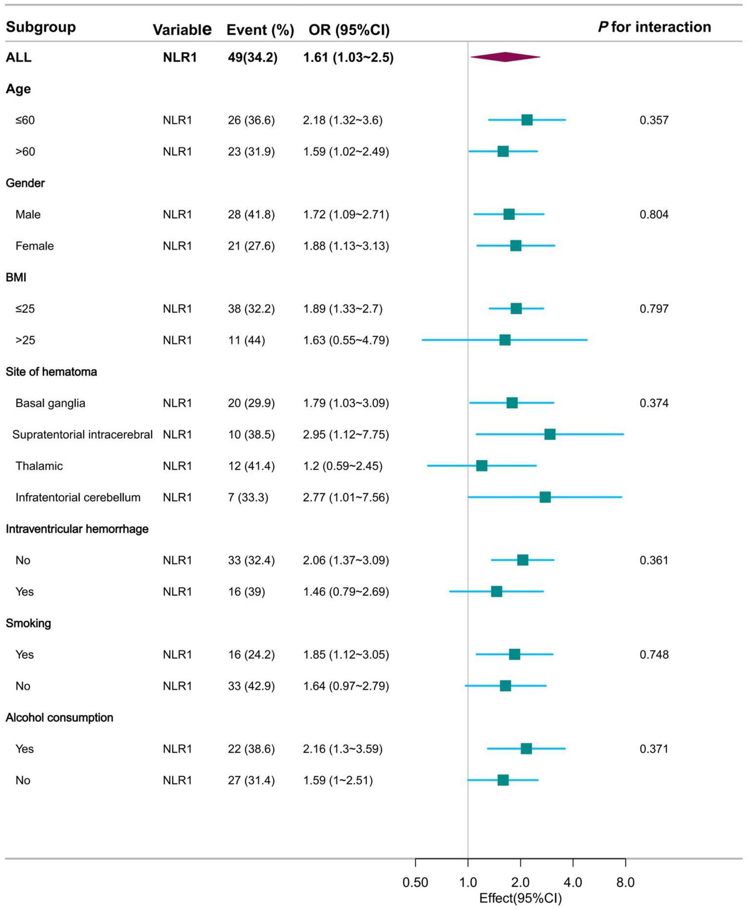 The multivariate analysis focused on analyzing the relationship between NLR as the dependent variable and the study outcome (oedema index) under the influence of different covariates. Therefore, we developed four models for multivariate analysis. In model 1, we did not adjust for any covariates. In model 2 we adjusted for two covariates, age and sex. In model 3, we continued to adjust for the covariates of haematoma location, whether it infiltrated the ventricle, GCS and NIHSS based on model 2. In model 4, we continued to adjust for the covariates of BMI, history of hypertension, history of diabetes mellitus, and smoking and drinking status based on model 3.