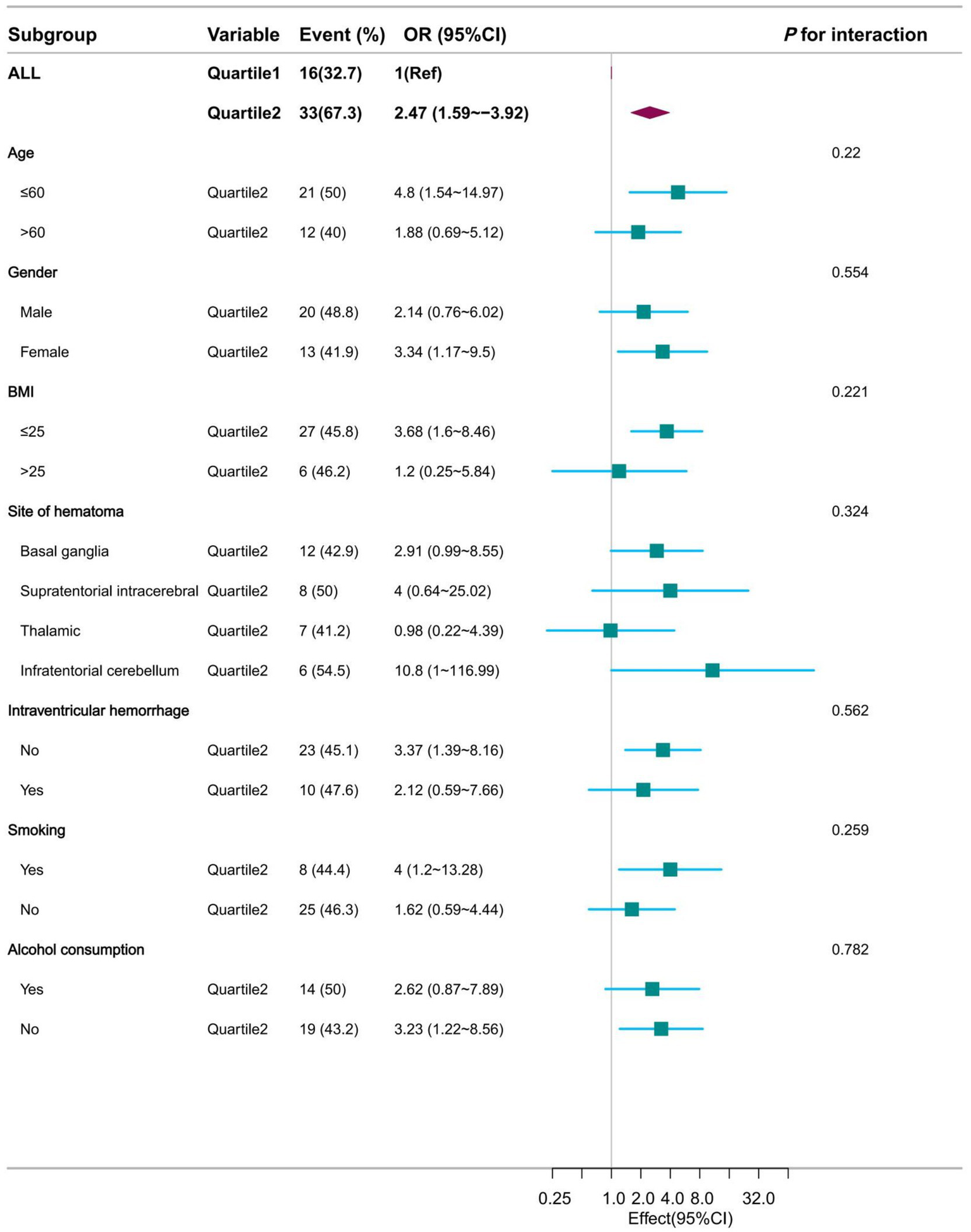 | Supratentorial intracerebral | 1.47 (0.57 ~ 3.79) | 0.427 |