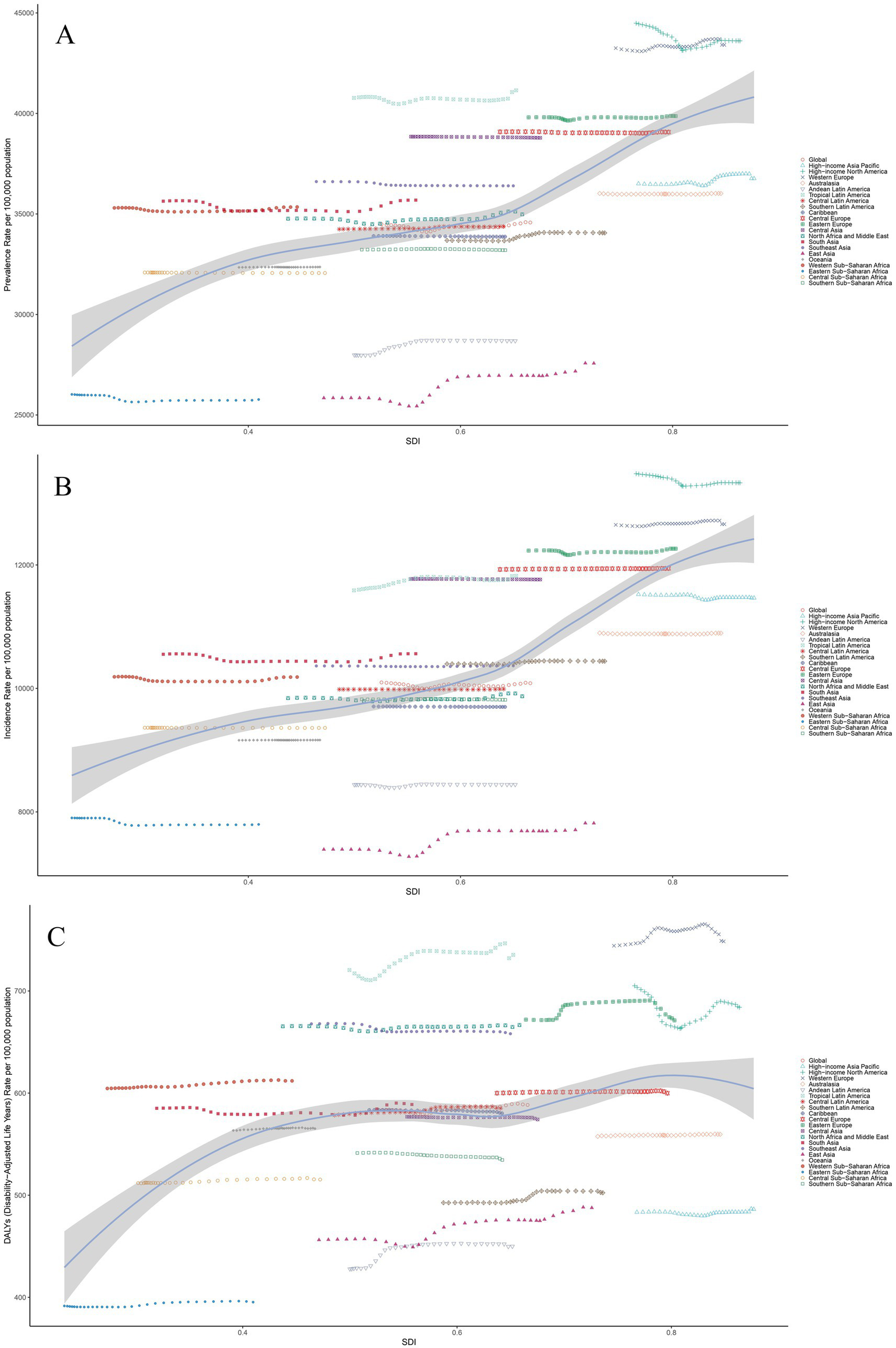 The associations between the SDI and headache disorder across 21 GBD regions. (A) Association between ASPR and SDI. (B) Association between ASIR and SDI. (C) Association between ASDR and SDI. (A–C) The association between SDI and ASPR, ASIR, and ASDR, respectively, across 21 GBD regions in 2021. The lines represent the overall trends, with individual points corresponding to each region, colored by their respective regions. Shaded areas indicate 95% uncertainty intervals. Notable variability is observed among regions, reflecting distinct socio-demographic and healthcare factors influencing the burden of headache disorders. ASPR, Age-Standardized Prevalence Rate; ASIR, Age-Standardized Incidence Rate; ASDR, Age-Standardized Disability-Adjusted Life Years; SDI, Socio-demographic Index; DALYs, Disability-Adjusted Life Years.