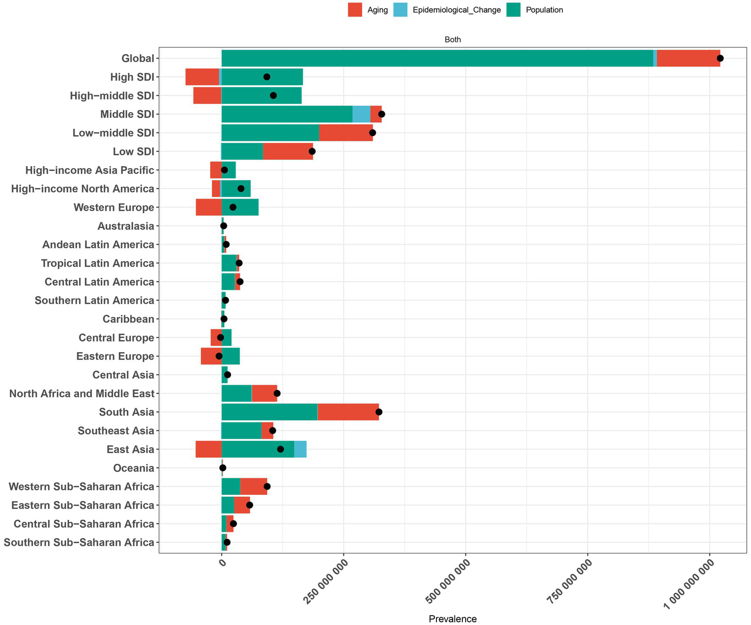 Decomposition analysis of headache disorder change in prevalence by SDI and 21 GBD regions, 1990 to 2021. Decomposition of the change in the prevalence of headache disorders from 1990 to 2021 by regions, showing contributions from aging, epidemiological change, and population growth. Red bars represent the contribution of aging, blue bars indicate epidemiological change, and green bars show population growth. The size of each bar corresponds to the respective regional contribution. The black dots represent the overall trend in disease burden change for each region. SDI, Sociodemographic Index; GBD, Global burden of disease.