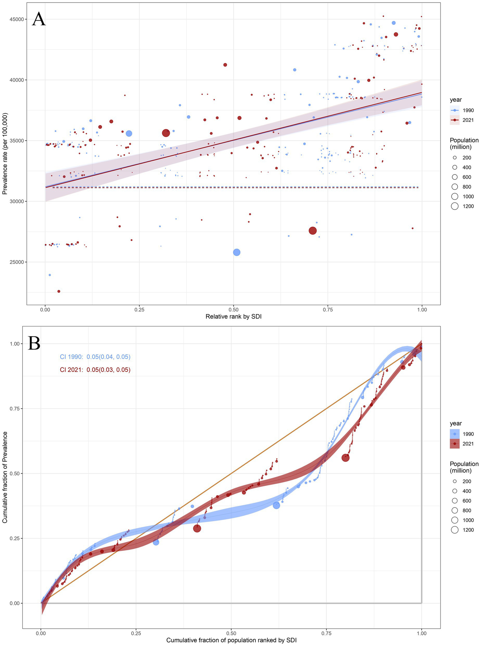 (A) Health inequality regression curves of prevalence for headache disorders. (B) Concentration curves of prevalence for headache disorders. (A) The relationship between ASPR and relative rank by SDI for headache disorders across 204 countries in 1990 and 2021. Points represent countries with varying population sizes, denoted by the size of the circle (population in millions). The blue dotted line represents the trend for 1990, and the red solid line shows the trend for 2021, along with shaded confidence intervals. (B) The cumulative fraction of ASPR for headache disorders across 204 countries in 1990 and 2021. Points represent the cumulative fraction of prevalence across different SDI categories, while the line reflects the cumulative trends in prevalence rates. The CI values for 1990 and 2021 are shown as well. ASPR, Age-Standardized Prevalence Rate; SDI, Sociodemographic Index; CI, concentration index.