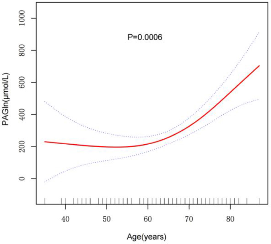 A segmented regression model identified a threshold point at 71 years for the relationship between age and PAGln levels (Table 2). Below 71 years, the effect of age on PAGln levels was not statistically significant, with an effect size of 2.135 (95% CI: −4.659, 8.929, P = 0.5394). In contrast, above 71 years, the effect size significantly increased to 35.520 (95% CI: 19.042, 51.998, P < 0.0001), indicating a marked exponential rise in PAGln levels. The significance of this threshold effect was further validated by a likelihood ratio test (P < 0.001), confirming a highly significant non-linear association between age and PAGln levels after 71 years, with a rapid increase in this age range.