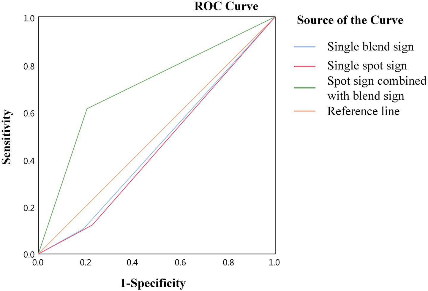 Among a total of 195 patients, 29 (14.8%) had single blend signs, 35 (17.9%) had single spot signs, 76 (39%) had combined signs, and 55 (28.2%) had CT-negative. A multivariate binary logistic regression analysis revealed that the spot sign combined with the blend sign (OR = 5.244, 95% CI: 2.606–10.55, p < 0.001) and hematoma expansion (HE) (OR = 2.063, 95% CI: 1.003–4.245, p = 0.049) were associated with poor outcomes (p < 0.001). The ROC curve analysis revealed that the sensitivity and specificity of the spot sign and blend sign combination for outcome prediction were 61.1 and 80.0%, respectively; the Youden index was 0.411, and the area under the curve (AUC) value was 0.706.