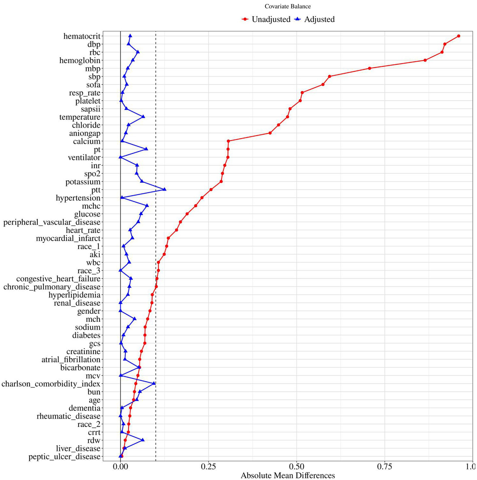 To control for confounding, propensity score matching (PSM) was performed using 1:1 nearest-neighbor matching with a caliper width of 0.1. Before matching, most covariates were significantly imbalanced between groups, with several standardized mean differences (SMDs) > 0.1, indicating substantial confounding. After matching, the SMDs of all covariates were substantially reduced, with most falling below 0.1, indicating that PSM effectively balanced baseline characteristics between the two groups (Table 1 and Figure 2). This supports the validity of subsequent comparisons, as observed differences are more likely attributable to the intervention rather than residual confounding.