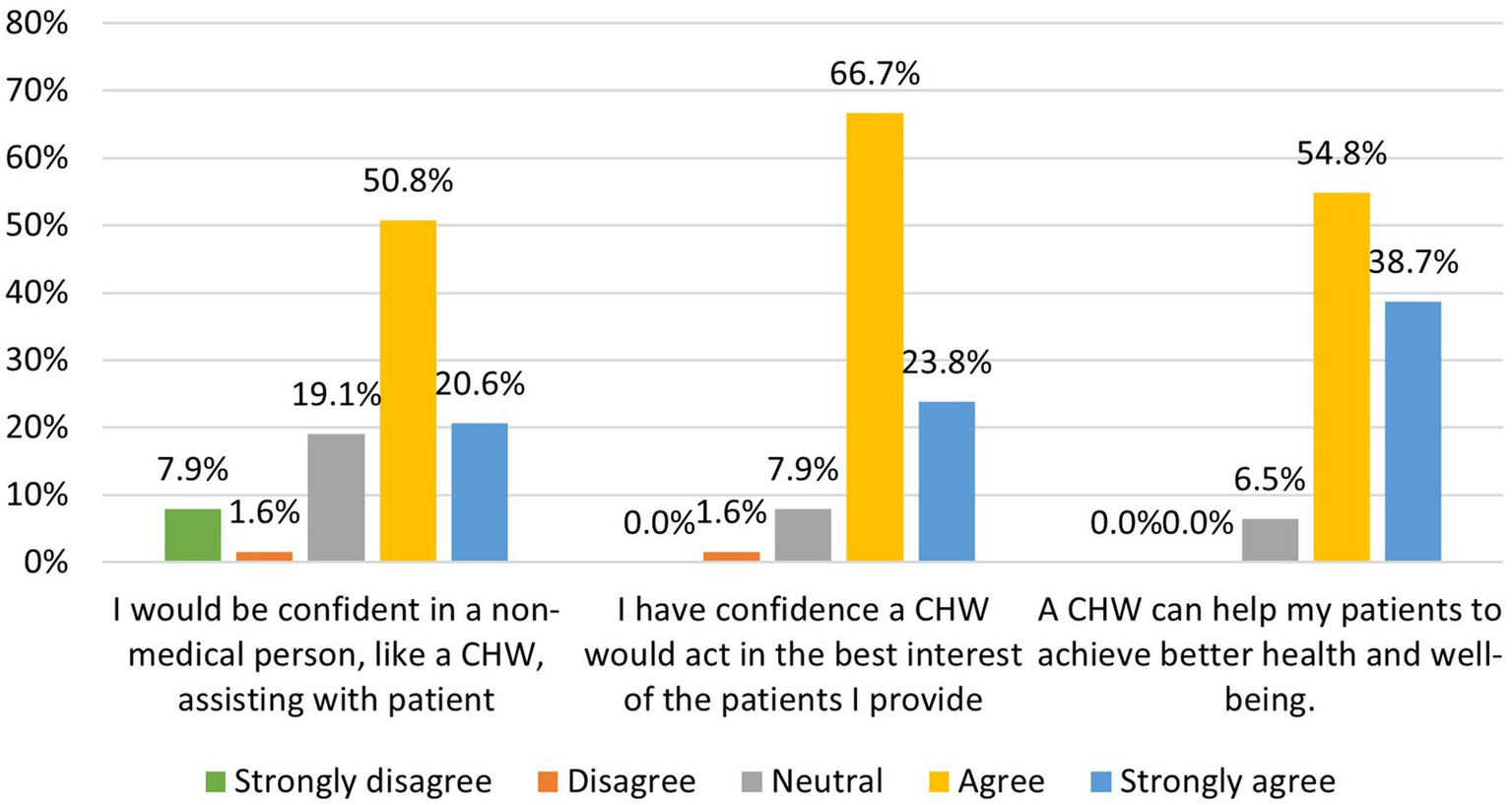 Survey responses from physicians (n = 42) compared to nurses and licensed social workers (n = 19) were similar with the exception of physicians expressing less awareness of the role a CHW could play on a medical team, the services a CHW could provide to patients, and scientific evidence supporting the role of CHW in chronic disease (Figure 4). In contrast, there were no statistically significant differences in clinician perception of addressing SDOH gaps between physicians and nurses/licensed social workers.