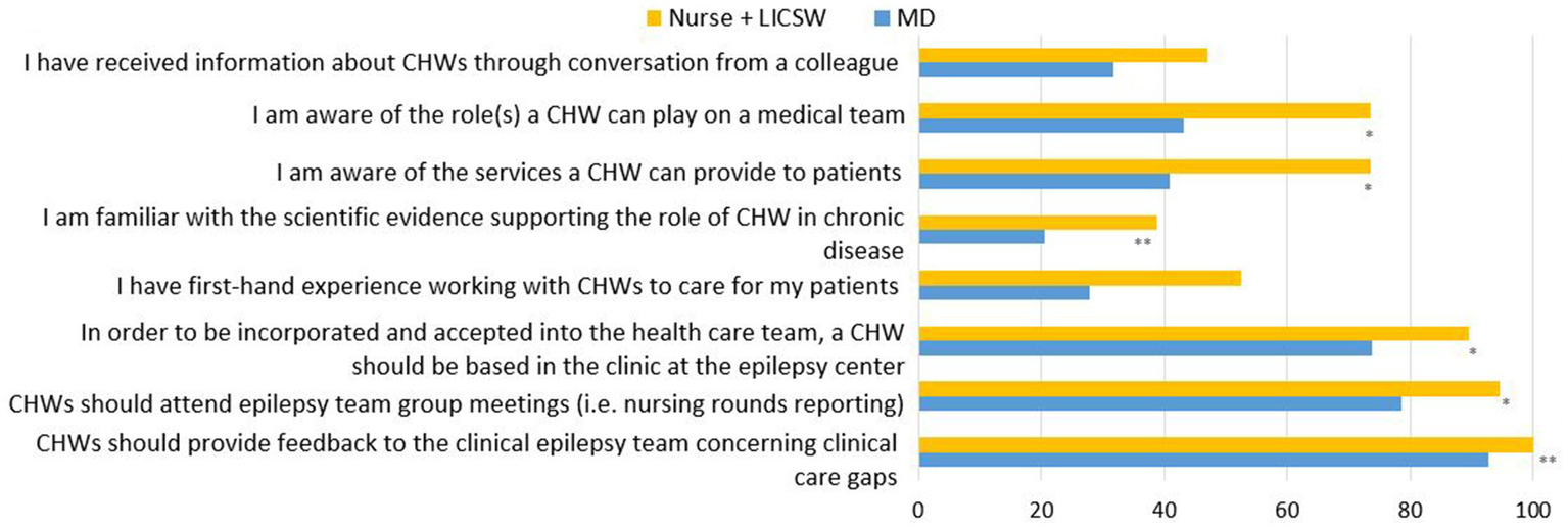 Main differences between physicians and nurse + social workers were detected in questions regarding the level of involvement of the CHW in the clinical care of the patients. Physicians expressed less need for CHWs to be based at epilepsy center clinics and less need for them to attend epilepsy team group meetings. There was also less agreement among physicians when compared with nurses/social workers regarding CHWs providing feedback to the clinical epilepsy team concerning clinical care gaps.