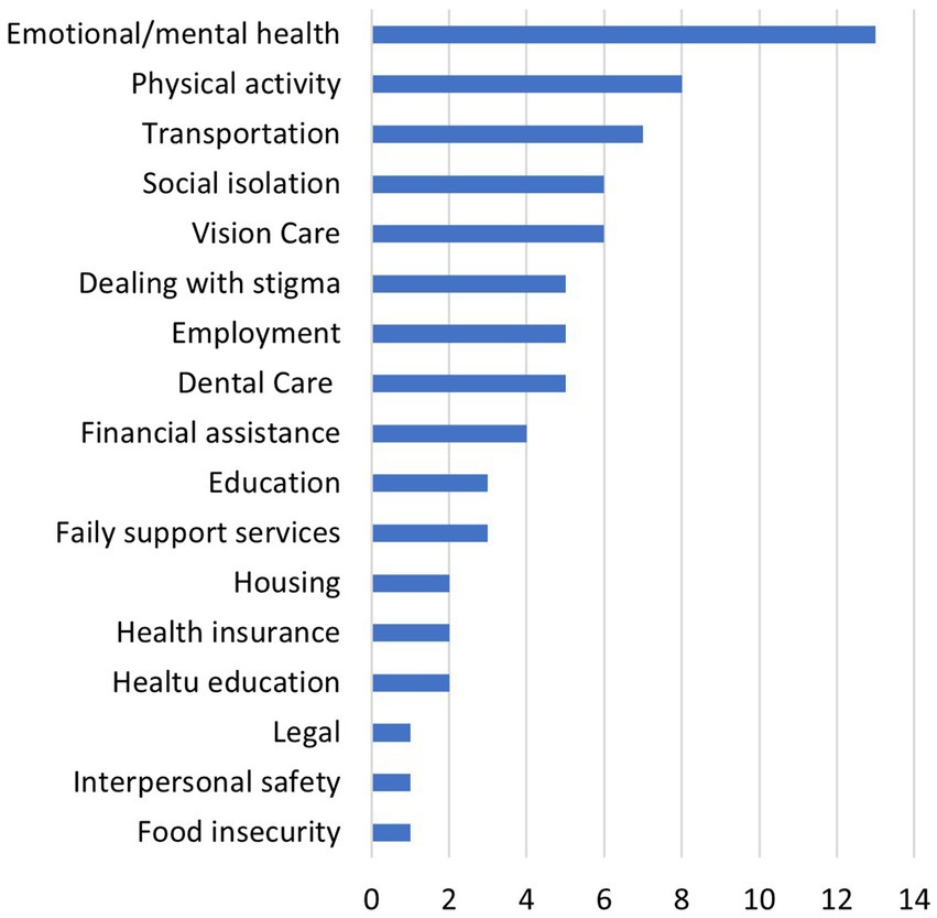 Survey participants’ baseline knowledge of CHWs was divided (42.8% with prior knowledge and 42.8% without, 14.2% not sure). About 7 out of 10 (66.6%) of patient respondents indicated they had not received care from a CHW (19% said yes, 14.2% were unsure). When asked about prior experience receiving assistance meeting SDOH needs, 42.9% of respondents reported they had received help directly from their physician; 33.3% reported another member of the care team (CHW 14.2%, nurse 14.2%, social worker 4.76%), and 19% reported not ever having received this kind of assistance. Roughly three-quarters of respondents (71%) believed a CHW could connect them with local resources in their communities (4.7% disagreed, 19% were unsure), and 76% of participants reported being willing to receive epilepsy education from a CHW (9.52% said no, 14.2% were unsure). Overall, belief in a CHW’s ability to address patient needs was mixed, with 42.8% of respondents indicating that they were confident in that CHW’s ability (52.3% neutral, 4.76% disagreed). Nearly two-thirds of respondents (61.9%) of agreed that working with a CHW would improve their health and well-being (38.1% neutral). Although the small sample size prevents a correlation analysis, patients who expressed less confidence in a CHW’s ability to address their needs or their ability to improve health and well-being tended to be slightly older; otherwise, they did not seem demographically different from those who felt more confident in a CHWs ability to assist with care. The top four SDOH needs reported by patient respondents include support with emotional/mental health, physical activity, transportation and social isolation (Figure 5).