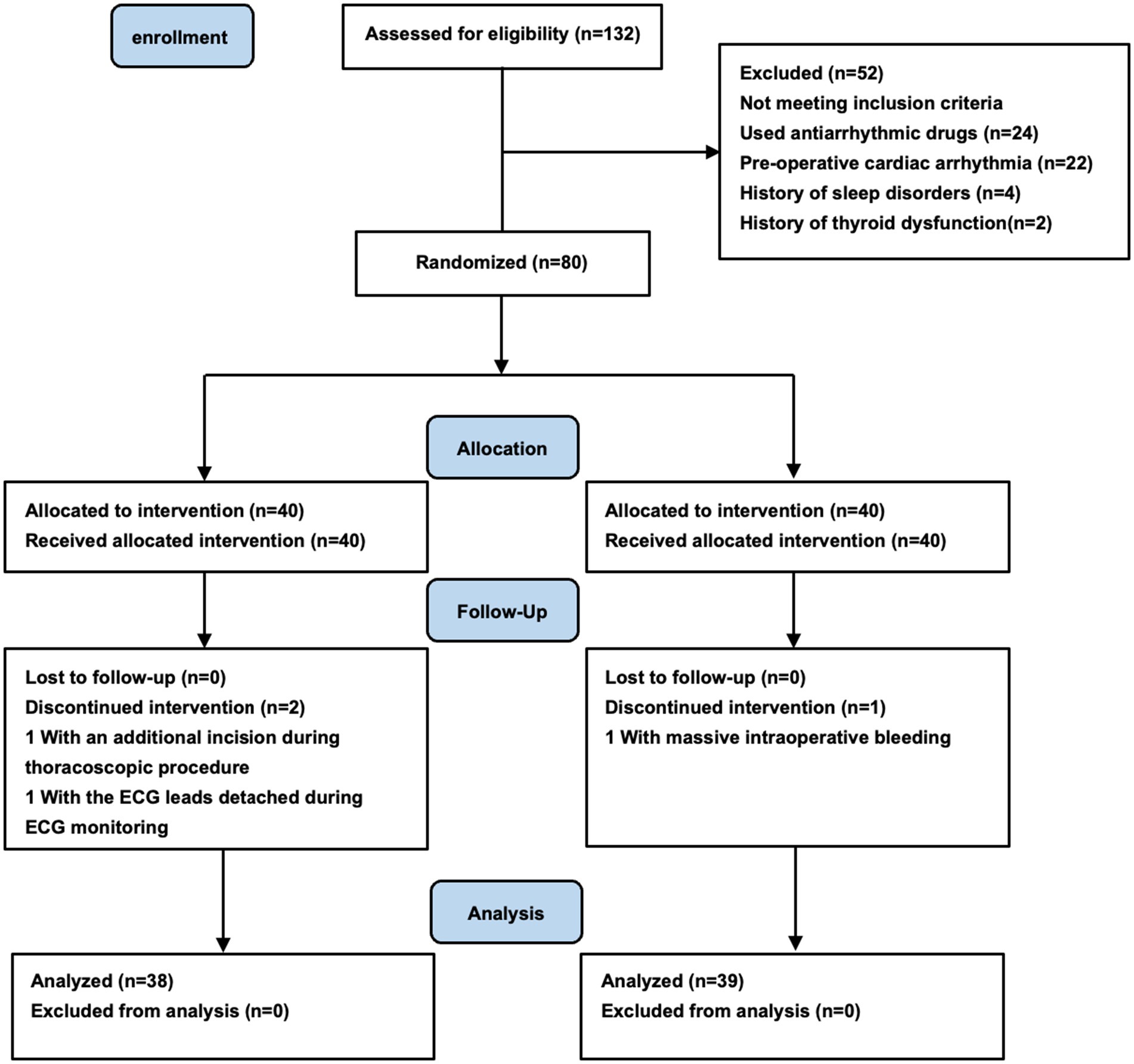 The primary outcome of this study was the incidence of POSVT during the first 24 h after thoracoscopic surgery. Our previous study had shown that the incidence of POSVT was 40% in patients undergoing non-cardiac thoracic surgery (1). Due to scarce similar studies, we carried out a pilot study before the start of this trial. We found that the incidence of POSVT after thoracoscopic surgery was reduced to about 11% with EA treatment. Therefore, it was supposed that POSVT would occur in 40% of the control group and 11% of the EA group. With a two-sided significance level of 5%, power of 80% and drop-out rate of 10%, the minimum number of patients required to detect a significant difference between the two groups was set at 80 (40 patients in each group).