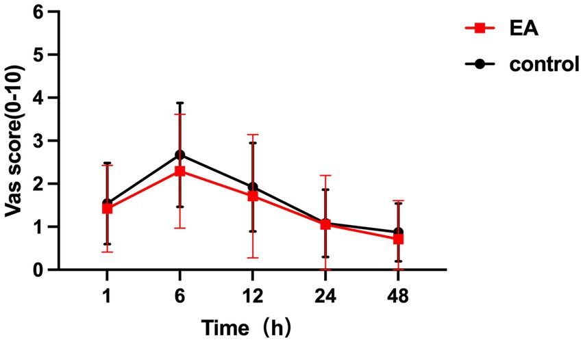 Figure 2. VAS scores from 1 to 48 h postoperatively in the EA group and the control group. No significant difference between groups.