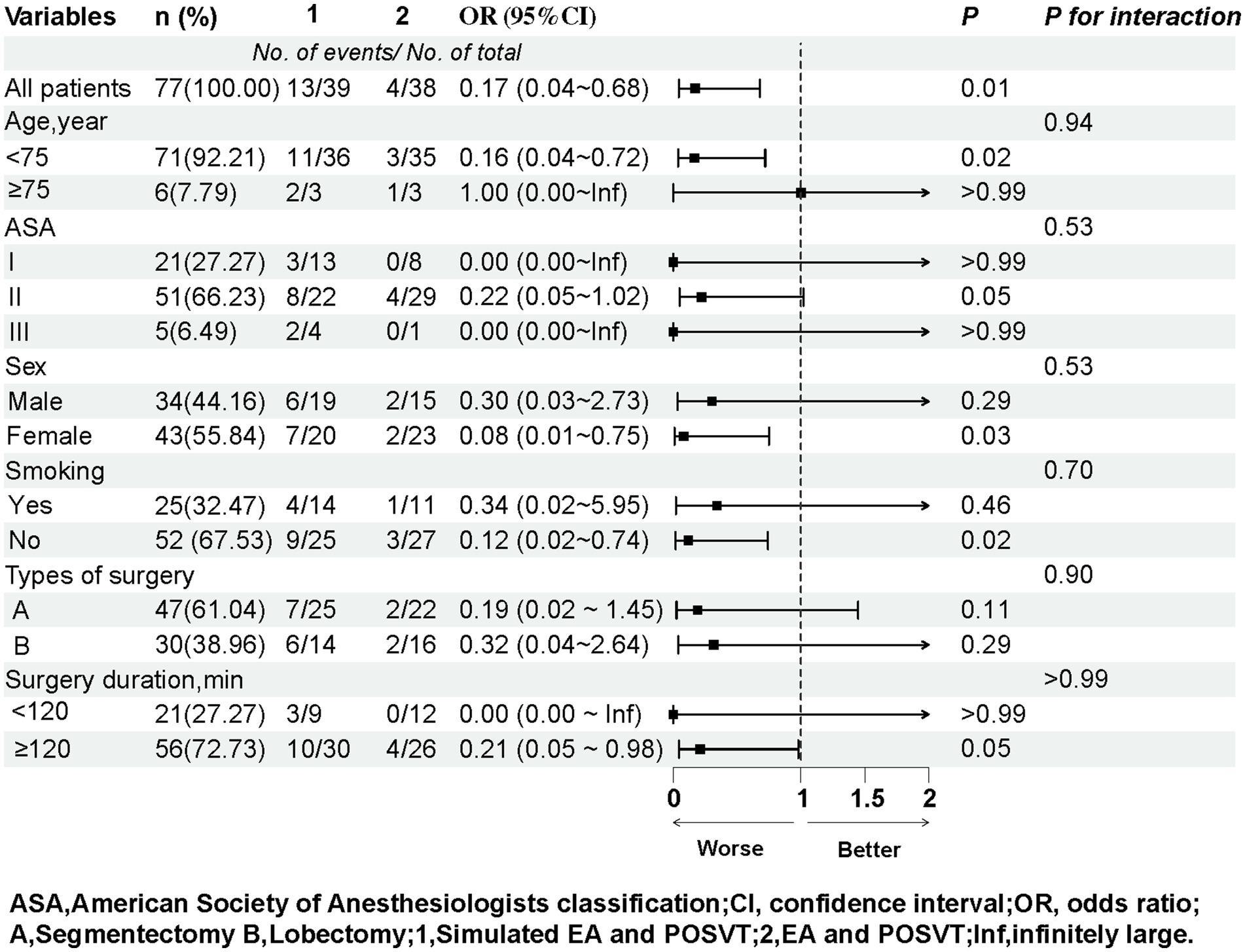 We performed subgroup analyses to explore the relationship between EA and POSVT in different subgroups (Figure 3). These subgroups were analyzed based on factors such as age, gender, ASA classification, smoking history, duration of surgery, and types of surgery to reveal significant associations between several factors and POSVT. However, these factors did not show significant associations with outcomes. No interactions were observed between subgroups. For detailed results of the subgroup analysis, please refer to Figure 3.