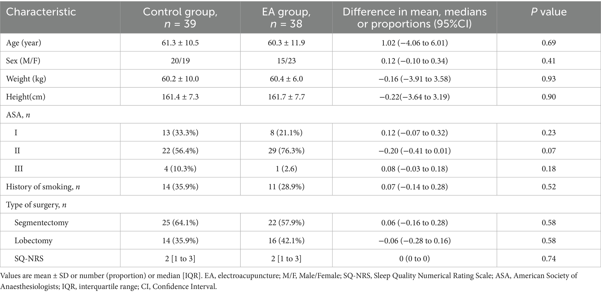 Between December 2023 and July 2024, 132 patients were screened for eligibility. 52 (39%) were excluded according to the exclusion criteria, and 80 patients were enrolled in this study. In the EA group, one patient had an additional incision during thoracoscopic procedure, and another patient had the ECG leads detached during ECG monitoring. Therefore, these two patients were withdrawn from the study. In the control group, there was also a patient who dropped out of the study due to massive intraoperative bleeding and the requirement for ICU delivery postoperatively (Figure 1). Finally, 77 patients finished the study and were included in the analysis. In all the patients recruited, adverse effects such as redness, swelling and inflammatory reactions were not observed at the acupuncture site.