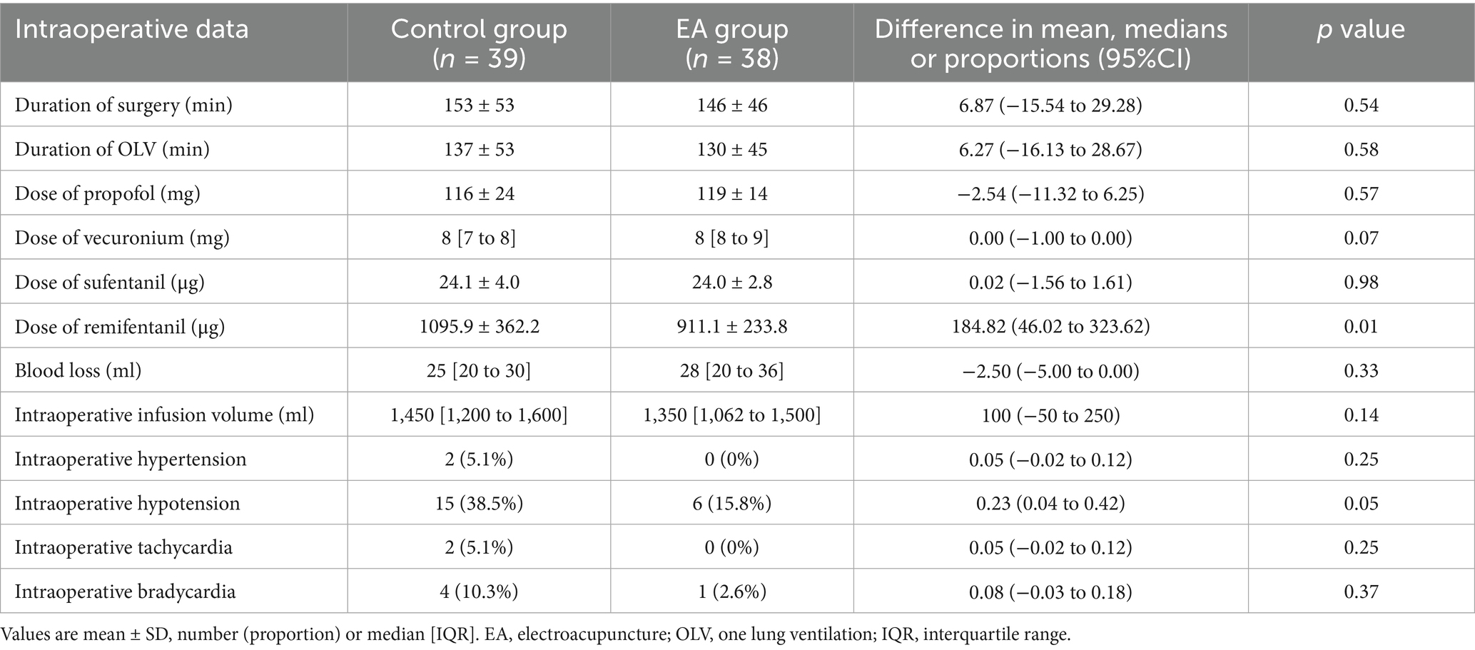 There were no significant differences between groups in baseline demographics and patient characteristics (Table 1). The dose of remifentanil was significantly reduced in the EA group; 1095.9 (362.2) vs. 911.1 (233.8) μg, p = 0.01. The incidence of intraoperative hypotension in the EA group was significantly lower than in the control group; 15 (38.5%) vs. 6 (15.8%), p = 0.05. No other significant differences were observed between the groups during anesthesia (Table 2).
