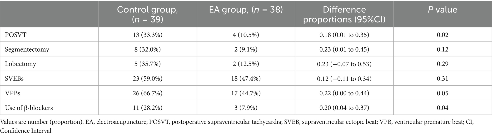 Postoperative arrhythmia was commonly observed in patients after thoracoscopic surgery for lung cancer. Compared with the EA group, the incidence of new-onset SVT was significantly higher in the control group during the first 24 h; 13 (33.3%) vs. 4 (10.5%), p = 0.02 (Table 3). There were no significant differences in the incidence of supraventricular ectopic beat and ventricular premature beat between groups (Table 3). A significantly more frequent use of β-blockers during the first 24 postoperative hours was observed in the control group; 11 (28.2%) vs. 3 (7.9%), p = 0.04 (Table 3).