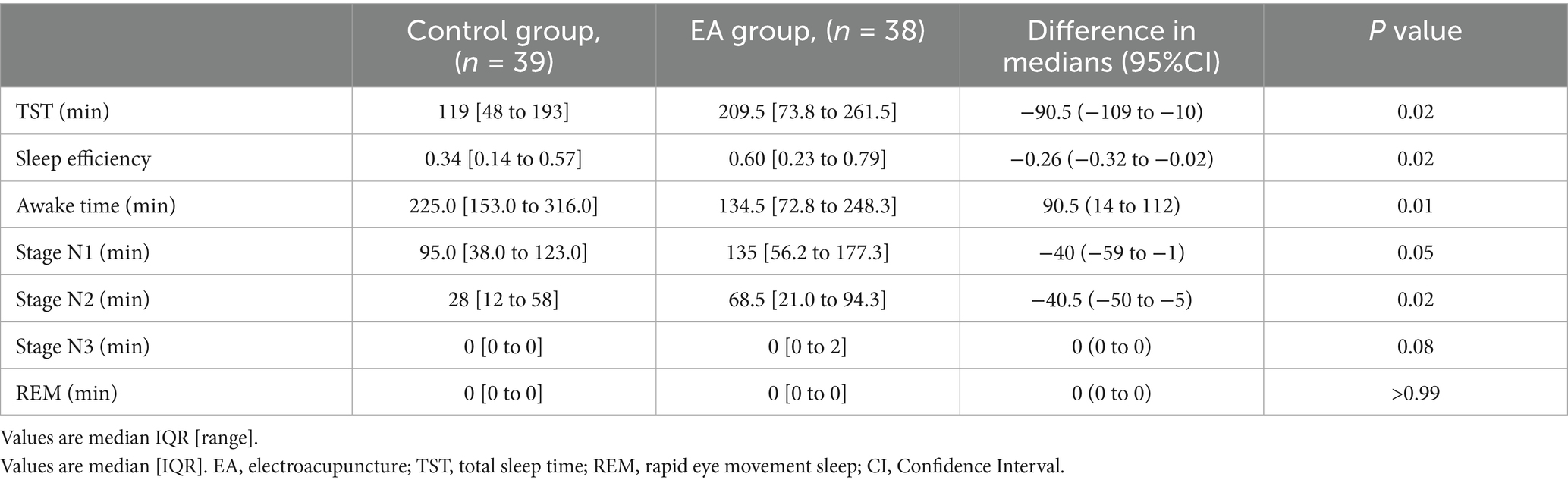 There were significant differences in the TST and sleep efficiency during the first postoperative night between the two groups; 119 (48–193 [10–294]) vs. 209.5 (73.8–261.5 [16–349]), p = 0.02 and 0.34 (0.14–0.57 [0.03–0.95]) vs. 0.60 (0.23–0.79 [0.03–0.95]), p = 0.02, respectively. Compared with the EA group, patients in the control group experienced significantly longer awake time; 225.0 (153.0–316.0 [17–372]) vs. 134.5 (72.8–248.3 [16–349], p = 0.01). The sleep duration of stage N1 and stage N2 was significantly longer in the EA group; 95.0 (38.0–123.0 [10–208]) vs. 135 (56.2–177.3 [9–242]), p = 0.05 and 28 (12–58 [0–125]) vs. 68.5 (21.0–94.3 [0–139]), p = 0.02, respectively (Table 4).