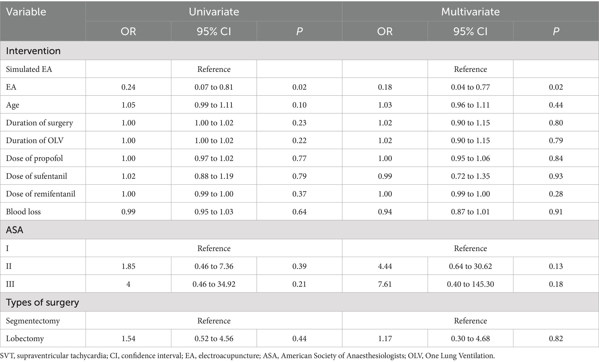 Univariate and multivariate logistic regression analyses examined the relationship between EA and POSVT (Table 5). In univariate analysis, EA was a protective factor for POSVT (OR 0.24, 95% CI 0.07–0.81, p = 0.02). Other important variables in the univariate analysis included age, duration of surgery, duration of OLV (one lung ventilation), dose of propofol, dose of sufentanil, dose of remifentanil, blood loss, ASA classification, types of surgery. After adjusting for age, duration of surgery, duration of OLV, doses of propofol, dose of sufentanil, dose of remifentanil, blood loss, ASA classification, and types of surgery, EA remained protective against POSVT (OR 0.18, 95% CI 0.04–0.77, p = 0.02). In contrast, in both univariate and multivariate logistic analyses, variables other than EA did not seem to significantly affect on POSVT.