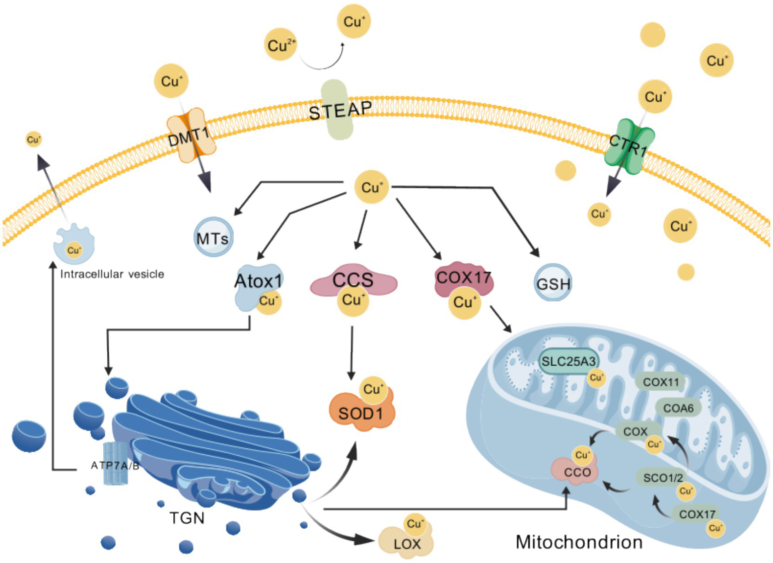 Overview of cellular copper homeostasis. Exogenous cupric ions (Cu2+) are first reduced to cuprous ions (Cu+) by the STEAP family of metalloreductases and subsequently imported into the cytosol via the membrane transporters CTR1 and DMT1; the resulting Cu+ is then precisely delivered to distinct targets by the copper chaperones ATOX1, CCS and COX17, while excess free copper is transiently sequestered by metallothioneins (MTs) and glutathione (GSH) to buffer cellular levels; when copper must be expelled, the P-type ATPases ATP7A and ATP7B pump Cu+ either out of the cell or into secretory vesicles; within the mitochondrial intermembrane space, SCO2 and COA6 cooperatively adjust the redox state of SCO1 so that it can bind Cu+ and hand the metal to cytochrome-c oxidase (CCO), whereas the inner-membrane carrier SLC25A3 transports Cu+ into the matrix to support this metallation process; these complementary mechanisms of uptake, storage, trafficking and efflux collectively ensure that copper-dependent enzymes—including CCO, lysyl oxidase (LOX) and superoxide dismutase 1 (SOD1)—acquire their essential metal cofactor, thereby sustaining cellular energy metabolism and antioxidant homeostasis. Created with BioGDP.com (236). CCS, copper chaperone for superoxide dismutase; COX17, cytochrome-c oxidase copper chaperone 17; MTs, metallothioneins; GSH, glutathione; SCO2, synthesis of cytochrome-c oxidase 2; COA6, cytochrome-c oxidase assembly factor 6; SCO1, synthesis of cytochrome-c oxidase 1; CCO, cytochrome-c oxidase, complex IV; SLC25A3, solute carrier family 25 member 3, mitochondrial phosphate carrier; LOX, lysyl oxidase; SOD1, superoxide dismutase 1.