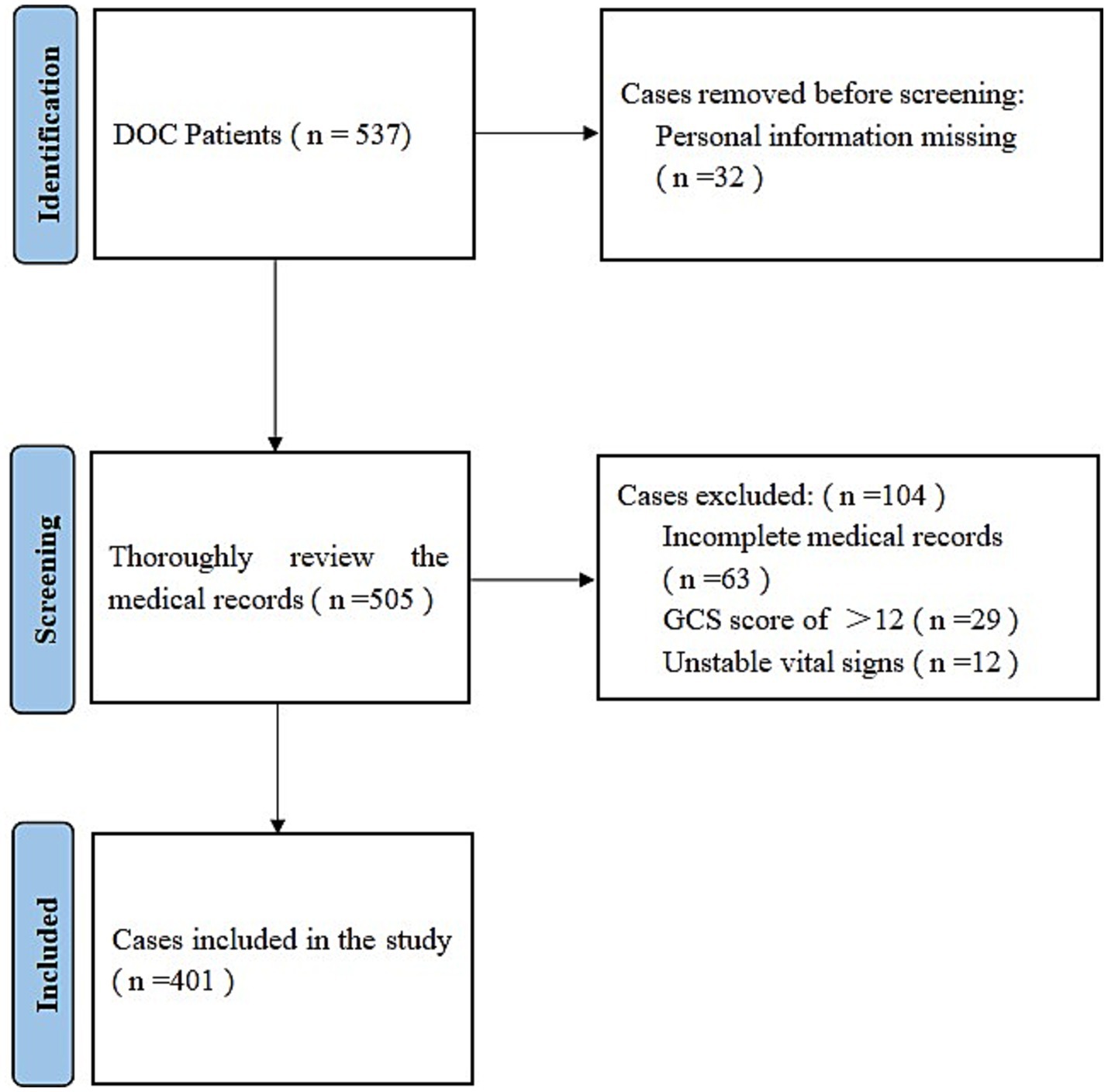Fulfills the diagnosis of DoC and has a GCS score of 3–12. Patients with DoC due to various causes, including traumatic brain injury, stroke, ischemic and hypoxic encephalopathy, brain tumors, and others. No gender restrictions. No restriction on duration of illness. First episode of DoC. Complete medical record data collection.