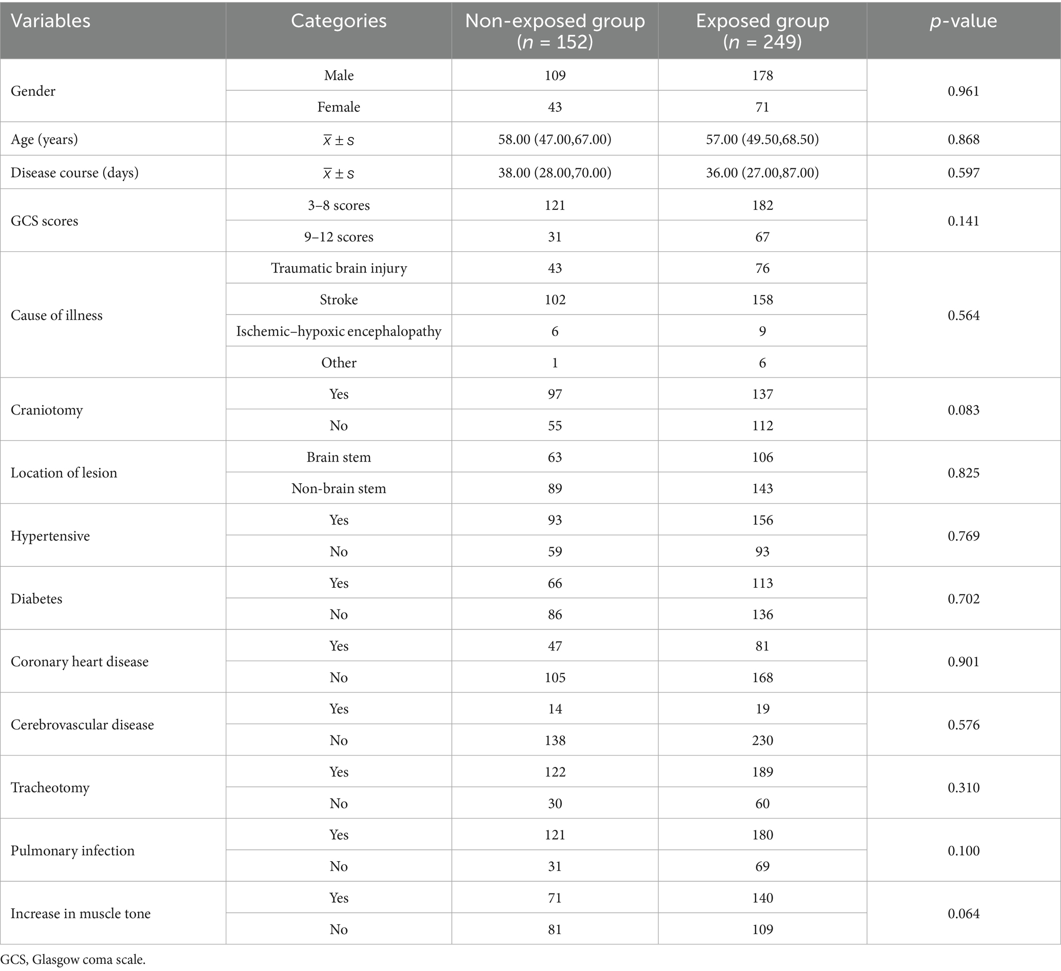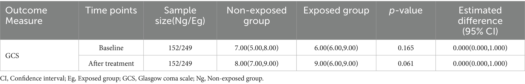 Since the two sets of data do not conform to a normal distribution, a nonparametric test is used. Comparisons of GCS scores between the two groups were not statistically significant at either the pre- or post-treatment levels (p > 0.05). Further details are shown in Table 2. A multiple linear regression model was used to control for possible confounding factors. Even after controlling for disease course, etiology, craniotomy, lesion location, and pulmonary infection, the results showed no statistical significance between exposure factors and outcomes (p > 0.05). This indicates that the results are reliable.
