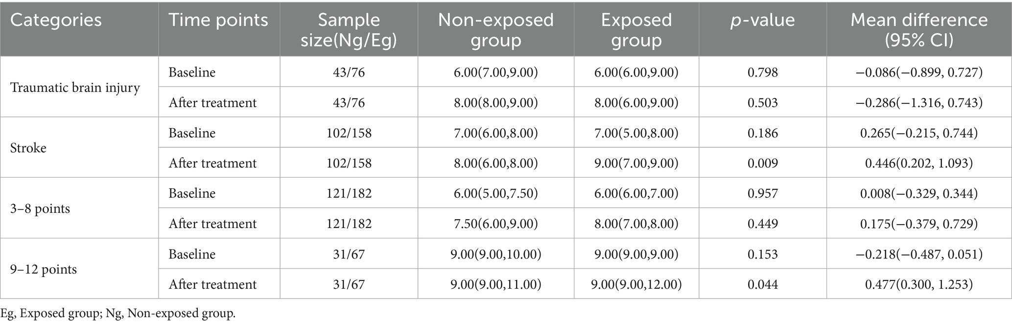 The comparison of GCS scores between the two groups was not statistically significant in traumatic brain injury patients either before or after treatment. There was no statistically significant comparison between the two groups in stroke patients before treatment. GCS scores were higher in the exposed group than in the non-exposed group after treatment in stroke patients, and the difference between the two groups was statistically significant. In comatose patients, the comparison of GCS scores between the two groups was not statistically significant either before or after treatment. In patients with moderate DoC, pre-treatment comparisons between groups were not statistically significant, and post-treatment GCS scores were higher in the exposed group than in the unexposed group, with a statistically significant difference between groups. Further details are shown in Table 3.