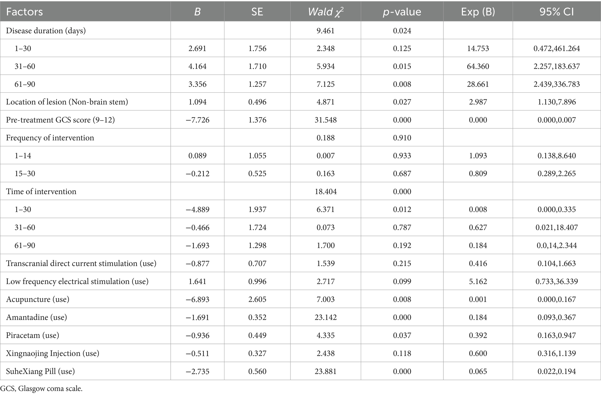 Univariate analysis showed that disease duration, lesion location, pretreatment GCS scores, frequency of interventions, duration of interventions, use of transcranial direct current stimulation, use of low-frequency electrical stimulation, use of acupuncture, use of amantadine, use of piracetam, use of xingnaojing injection, use of donepezil, and use of SuheXiang Pill were statistically different between the good and poor prognosis groups (p < 0.05). More details are shown in Table 4.