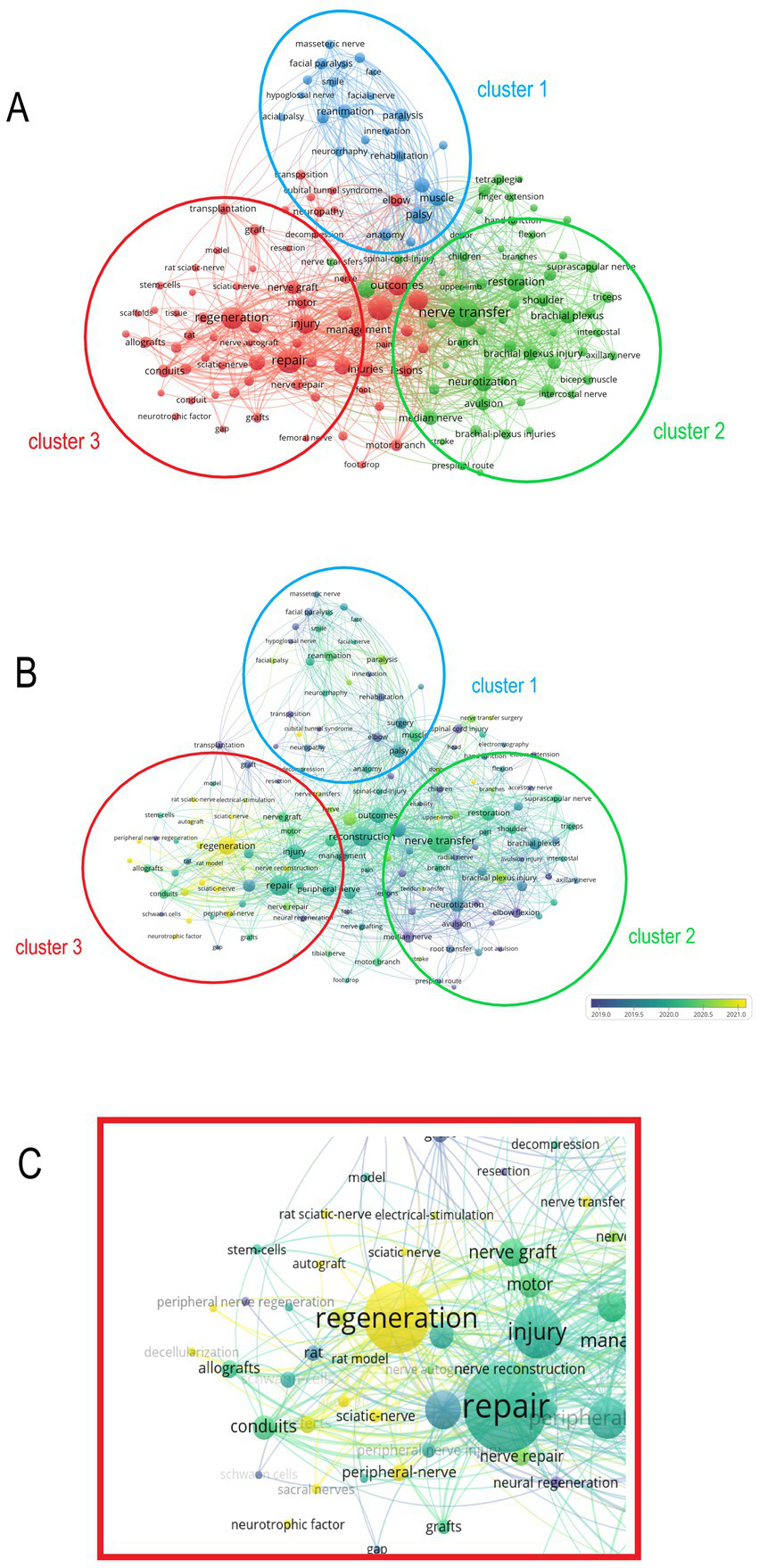 Analysis of keywords in all publications. (A) Mapping of the keywords in the field of nerve grafting. The size of the circle represents the frequency of the keyword, and different colors represent different clusters. (B) Distribution of keywords according to the average time of appearance. Blue represents an early appearance, and yellow represents a late appearance. (C) The latest cluster of keywords, the latest keyword is sacral nerve.