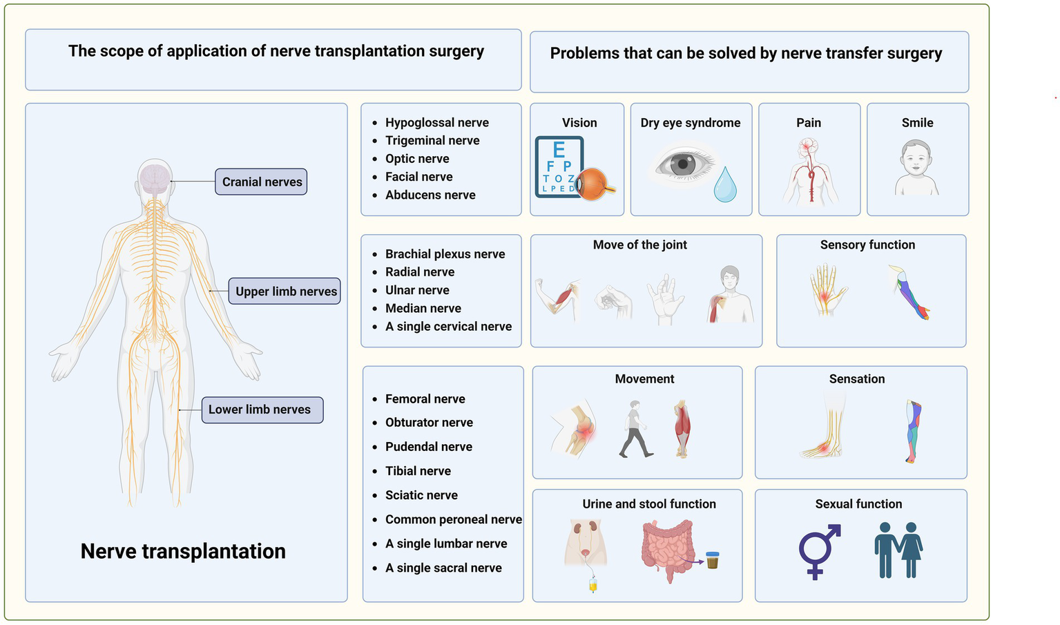 Similarly, lower limb nerves have attracted more attention in recent years. In addition to the transplantation of a single lumbar and sacral, its branches, such as the tibial nerve, common peroneal nerve, femoral nerve, and obturator nerve, can also be transplanted. Compared with the upper limb nerves, lumbosacral nerves control the human body’s urination, defecation, and sexual functions in addition to motor and sensory functions, and nerve transplantation can regulate these functions, thereby improving the quality of life (22, 23) (Figure 6).