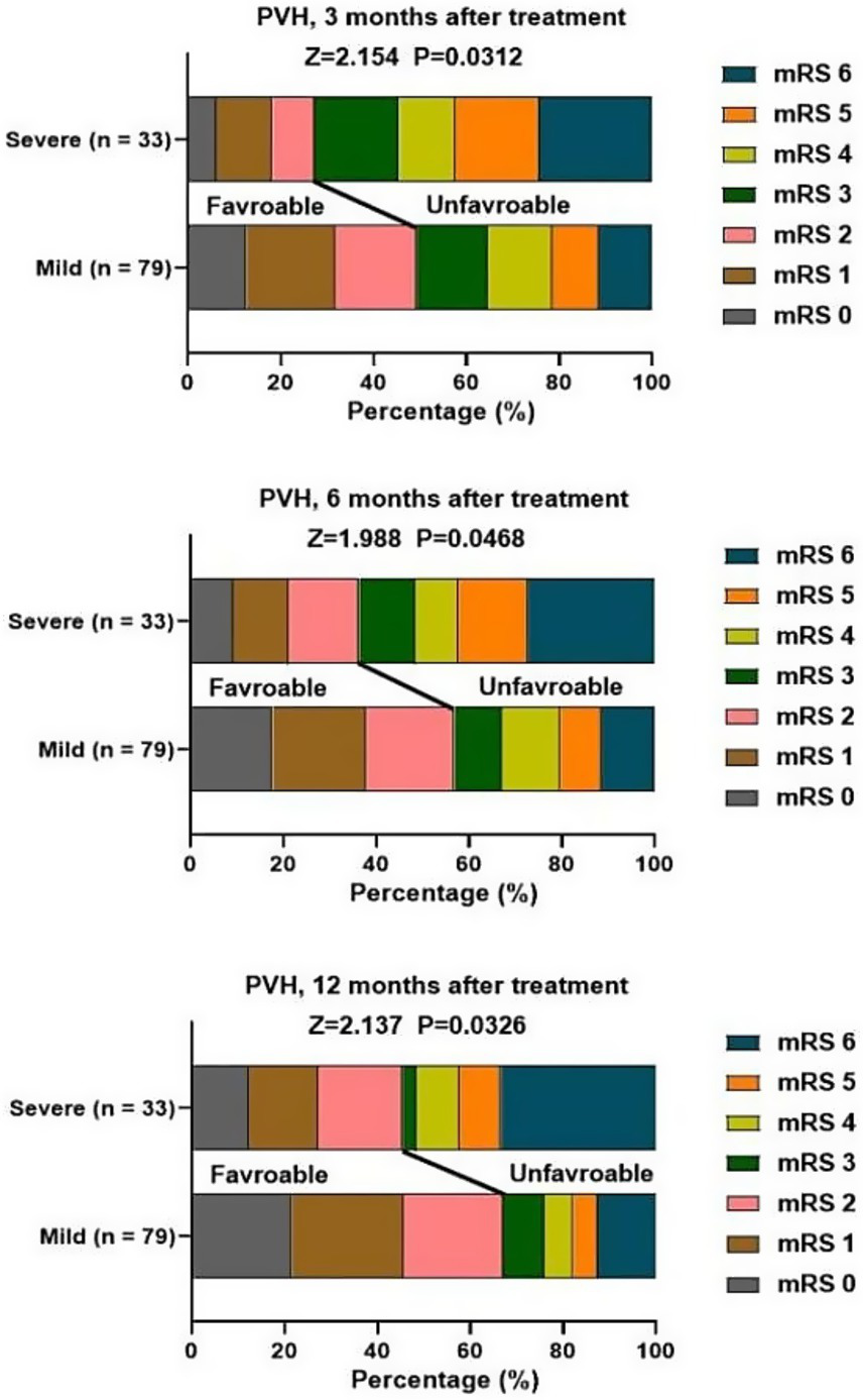 Association of PVH and mRS score at 3, 6, 12 months after treatment.
