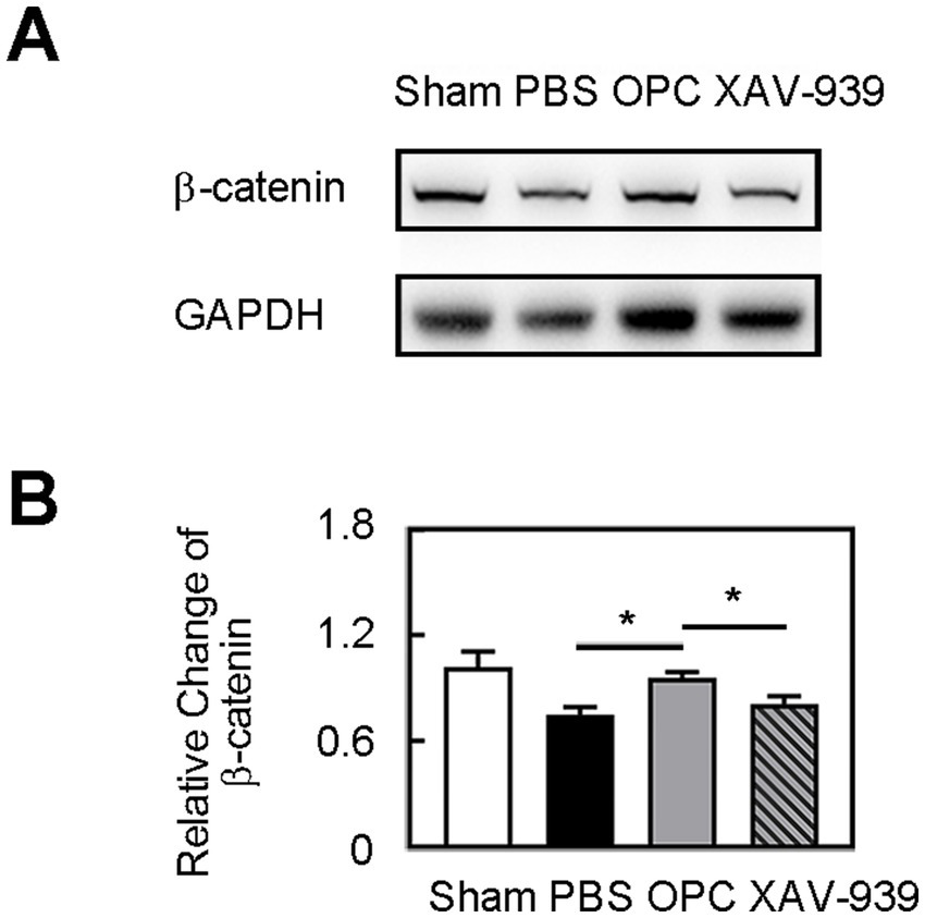 OPC transplantation increased β-catenin level. (A) Western blot of β-catenin expression in sham, PBS, OPC, and OPC plus XAV-939 groups at 3 days after tMCAO. (B) Bar graph of relative expression of β-catenin. N = 4 per group. Data are mean SD, *p < 0.05.