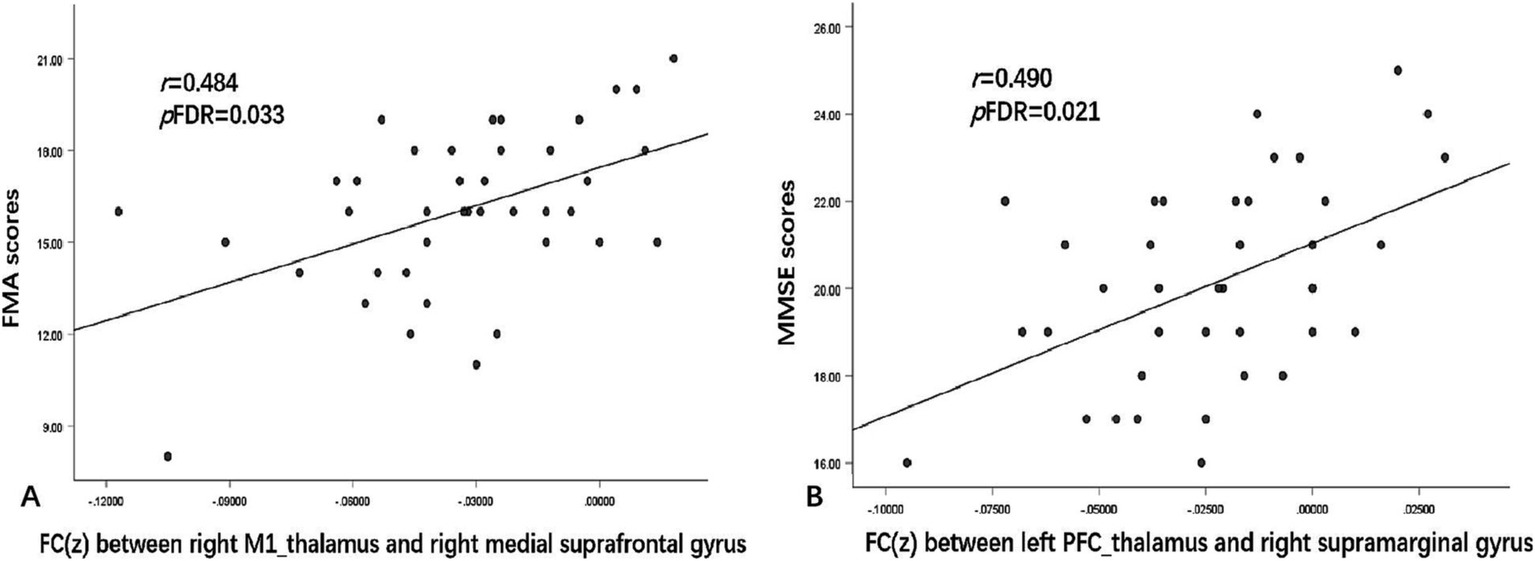 Correlations between FC and clinical symptom scores. (A) shows the FC values between the right M1_thalamus and right medial suprafrontal gyrus, which were positively correlated with FMA scores (r = 0.484, pFDR = 0.033). (B) shows the FC values between the left PFC_thalamus and right supramarginal gyrus, which were positively correlated with MMSE scores (r = 0.490, pFDR = 0.021). r represents the Pearson correlation; p represents the significance level. MMSE, Mini-Mental State Examination; FMA, Fugl–Meyer Assessment; FDR, false discovery rate.