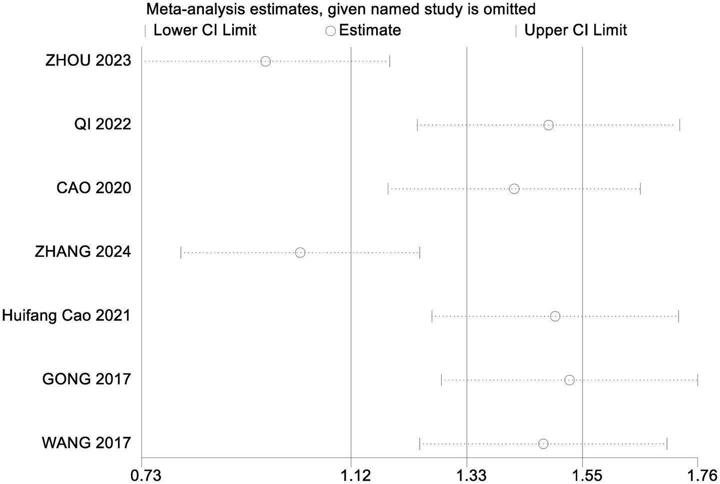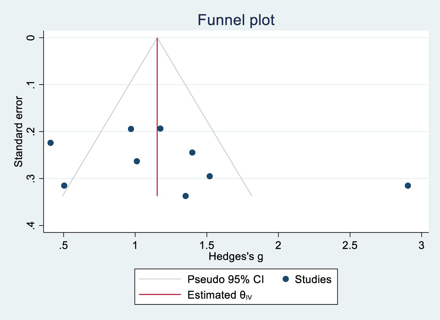 To assess the robustness of the meta-analysis findings and identify studies contributing to heterogeneity, a sensitivity analysis was performed by sequentially removing individual studies (Table 6). Excluding the study by Qi Hongna (1), which included older participants (mean age >60 years), resulted in a pooled effect size of SMD = 1.13 (95% CI: 0.91 to 1.35; p < 0.001), with heterogeneity reduced from 58 to 25%. This suggests that age may be a key source of variability. Across all sensitivity iterations, the pooled SMDs ranged from 0.97 to 1.09 and I2 ranged from 57 to 64%, with all p-values remaining <0.001, indicating stable and reliable results. Bubble diagrams are shown in Figures 2, 3.