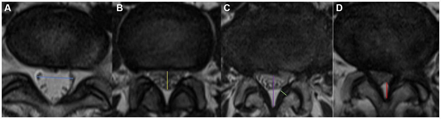 Relevant indicators included the APDS, TDD and APDD, LF thickness, thickness of the lumbar EF at the L3/4 and L4/5 intervertebral disc levels and the presence of the SedSign, intervertebral disc herniation, and HIZ; and the cross-sectional classification of increased EF on T2-weighted MR imaging.