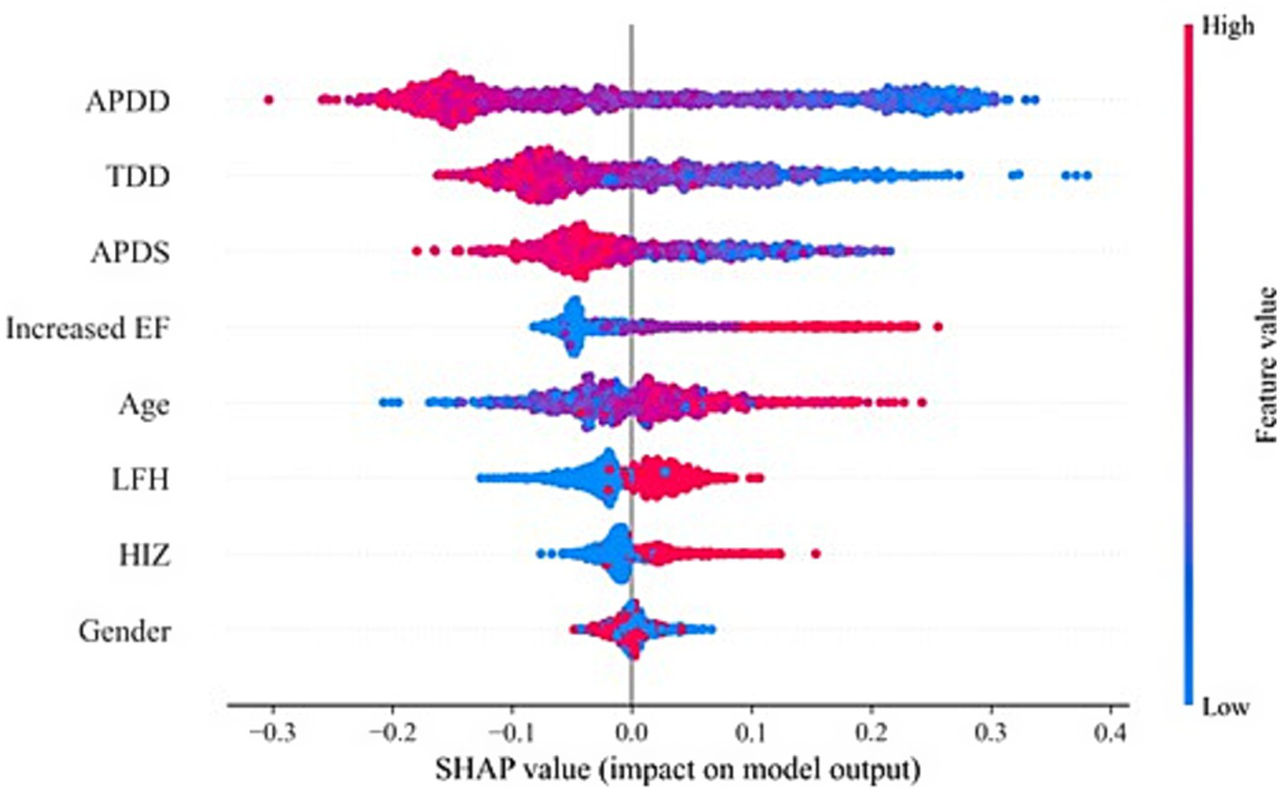 Therefore, this study considers the APDS, transverse (TDD) and anteroposterior diameters of the dural sac (APDD), LDH, HIZ, LF thickening, and SEL as multiple independent variables and the presence of the SedSign as the dependent variable to develop and validate an interpretable machine learning model for identifying the risk factors for the occurrence of the SedSign in patients with LSS. The ultimate goal of this model is to improve treatment strategies through the integration of MRI findings in LSS patients by enabling early diagnosis and early treatment and to improve patient outcomes through more targeted treatment methods, thereby optimizing the management of LSS.