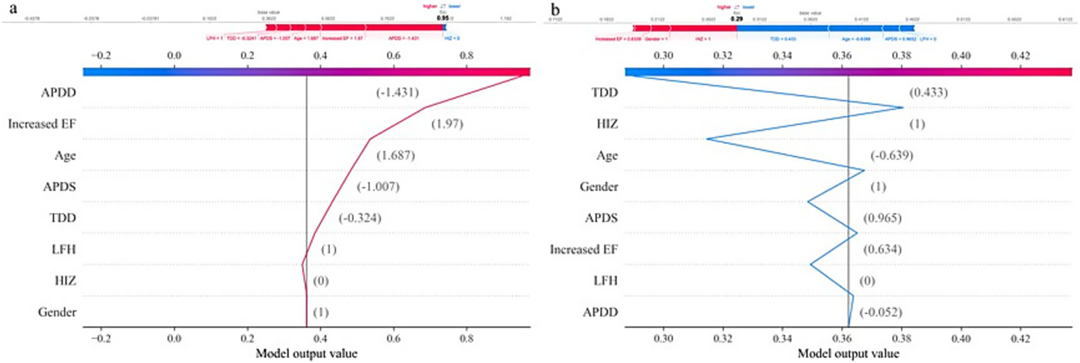 Dependence of APDD on age. In addition, personalized risk factor alerts can be constructed on the basis of SHAP values to quantify the risk of LSS combined with SedSign. For example, Patient M is a 79-year-old male with an APDS of 11.25 mm, an APDD of 5.11 mm, a TDD of 12.51 mm, an increased cross-sectional EF classification of grade 2, without HIZ but with concurrent LFH. Although the lack of HIZ in patient M decreases his risk, the values of all other features increase his risk; overall, therefore, this patient is prone to presenting with the SedSign (Figure 6a). As another example, Patient N is a 46-year-old male with an APDS of 14.39 mm, an APDD of 8.13 mm, a TDD of 15.01 mm, an increased cross-sectional EF classification of grade 1, with concurrent HIZ but without LFH. The patient’s sex, EF grade, APDD value, and concurrent HIZ all contribute to increasing his risk, whereas his age, APDS value, TDD value, and absence of LFH contribute to reducing his risk. Overall, the patient is unlikely to experience the SedSign (Figure 6b).