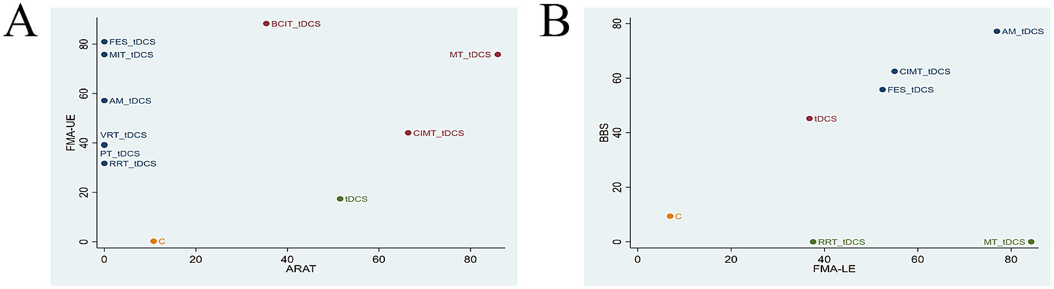 A total of 74 RCTs were included in this study, encompassing 4,335 PSSS and 11 intervention strategies. The NMA revealed that brain-computer interface therapy (BCIT) in combination with tDCS [surface under the cumulative ranking curve (SUCRA) = 88.34%] was the most effective tDCS-based intervention for improving the Fugl-Meyer Assessment for Upper Extremity score in PSSS. Mirror therapy (MT) in combination with tDCS (SUCRA = 85.96%) was identified as the optimal intervention for enhancing the Action Research Arm Test score in PSSS. MT + tDCS (SUCRA = 84.29%) was the best approach for improving the Fugl-Meyer Assessment for Lower Extremity score. Additionally, acupuncture and moxibustion (AM) in combination with tDCS (SUCRA = 77.16%) was the most effective intervention for increasing the Berg Balance Scale score in PSSS. The two-dimensional clustering analysis showed that MT + tDCS (SUCRA = 75.83%/85.96%) was the optimal tDCS-based rehabilitation strategy for treating upper limb motor dysfunction in PSSS, while AM+tDCS (SUCRA = 76.94%/77.16%) was the best tDCS-based rehabilitation strategy for improving lower limb motor dysfunction in PSSS.