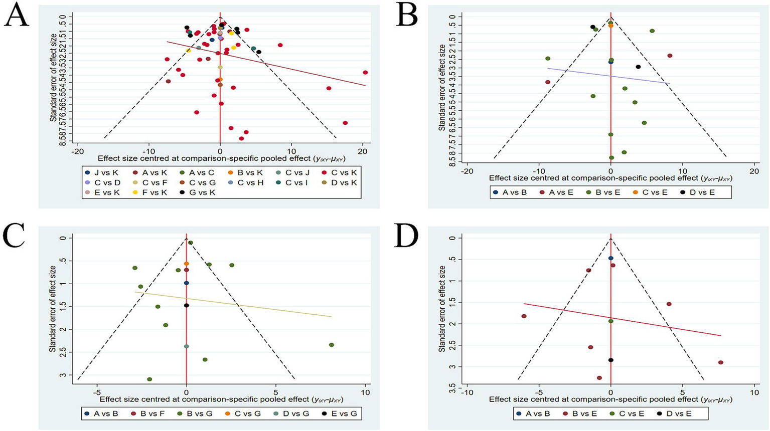 This study utilized R 4.2.1 with the “gemtc” and “coda” packages and Stata 15 with the “gemtc” package to perform NMA. Continuous outcome variables were analyzed using mean difference (MD), with 95% credible interval (CrI) for interval estimation. A consistency model was established with 20,000 burn-ins and 50,000 iterations. The deviance information criterion (DIC) was used to compare the consistency model with the inconsistency model, and if the DIC difference was <5, the direct and indirect comparisons were considered consistent. For each outcome measure, the surface under the cumulative ranking curve (SUCRA) was used to rank the efficacy of different interventions. A two-dimensional clustering analysis was conducted to explore the optimal intervention. A comparison-adjusted funnel plot was generated to assess potential publication bias. A regression analysis between publication year and intervention effect was conducted using R Studio to evaluate whether the publication year influences the intervention effect. This NMA employed a burn-in of 20,000 iterations and 50,000 subsequent iterations. Convergence diagnostics, including the Gelman-Rubin statistic and visual inspection of trace plots, confirmed that the model met the stability requirements.