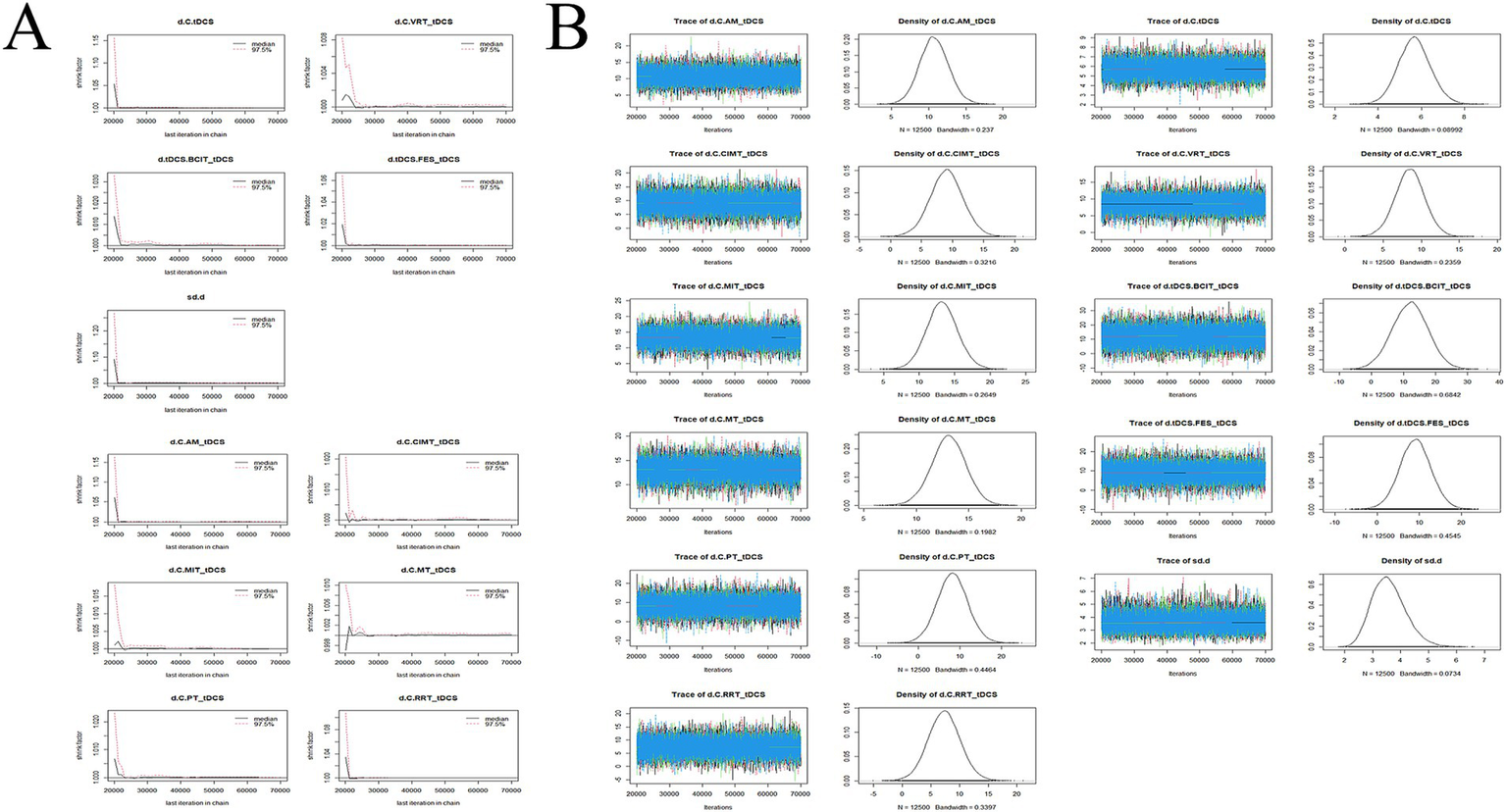 Network meta-analysis (NMA) is a specialized form of meta-analysis that integrates direct, indirect, and mixed comparisons of different interventions. This approach enables the evaluation of the relative efficacy of various treatments and ultimately facilitates the identification of the most effective intervention (17). In this study, we applied NMA to compare the therapeutic effects of tDCS combined with other rehabilitation interventions in the rehabilitation of motor dysfunction in PSSS. The objective is to determine the most effective tDCS-based rehabilitation approach and offer valuable evidence to guide clinical decision-making.