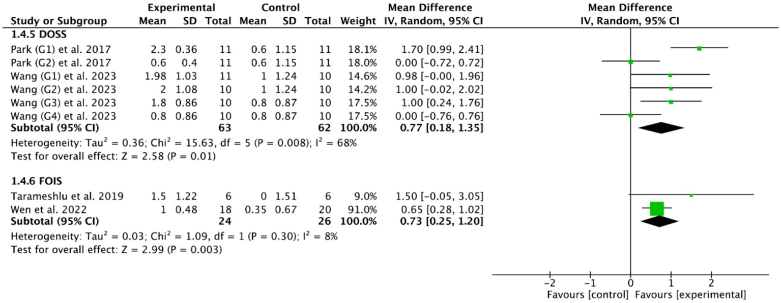 Statistical analyses were performed using Revman 5.40 with the extracted datasets. For meta-analysis implementation, model selection followed heterogeneity thresholds: random-effects models were applied when I2 ≥ 50%, while fixed-effects models were adopted for I2 < 50% cases. Mean Deviation (MD) and 95% Confidence Interval (CI) were used to represent the magnitude of the effect size of the research results.